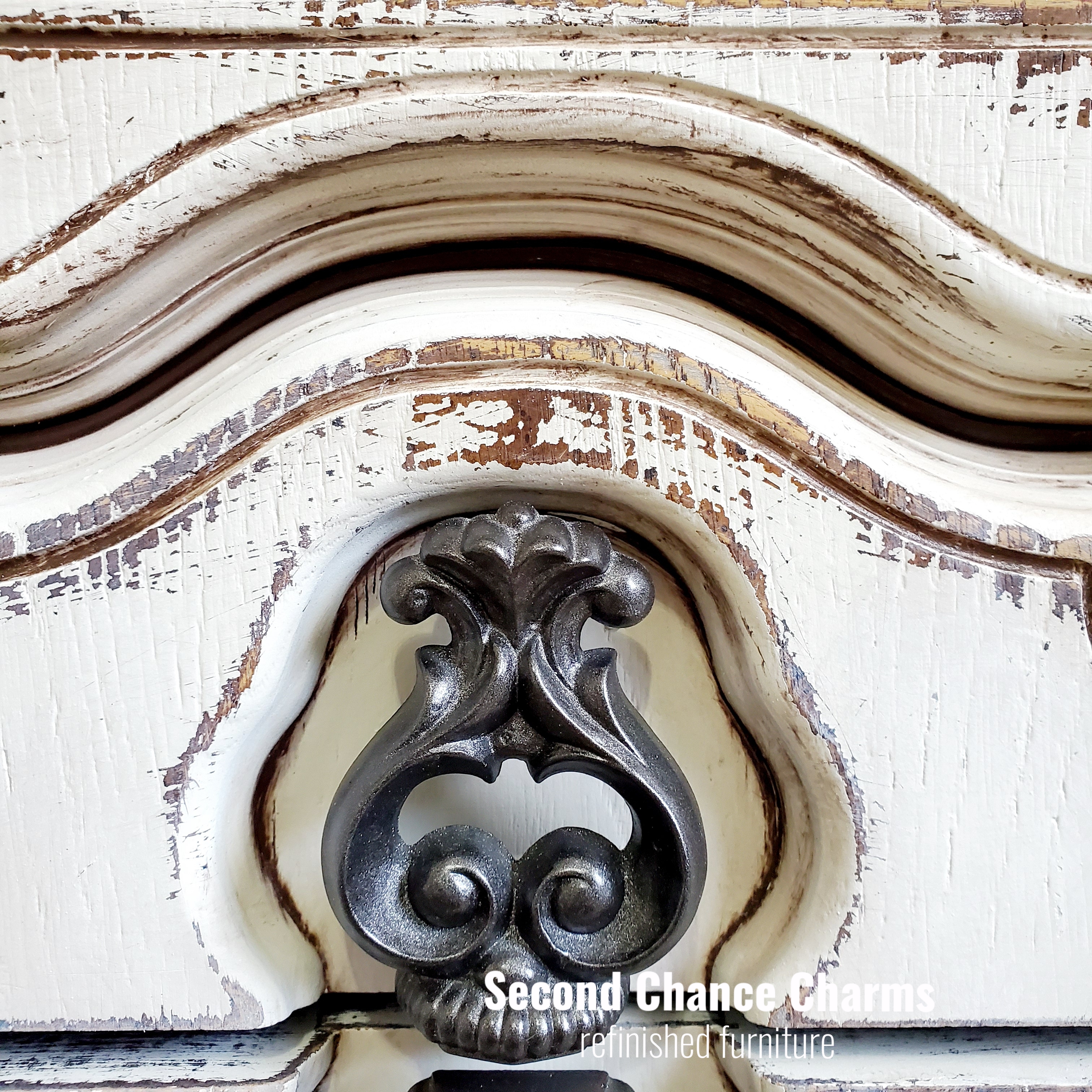 Refinished in Sherwin-Williams Pure White and distressed heavily. I went into certain spots and did a white wash to lessen the wood showing through. Im excited for this piece and to do more techniques like it in the future! Hardware is left original and cleaned up.