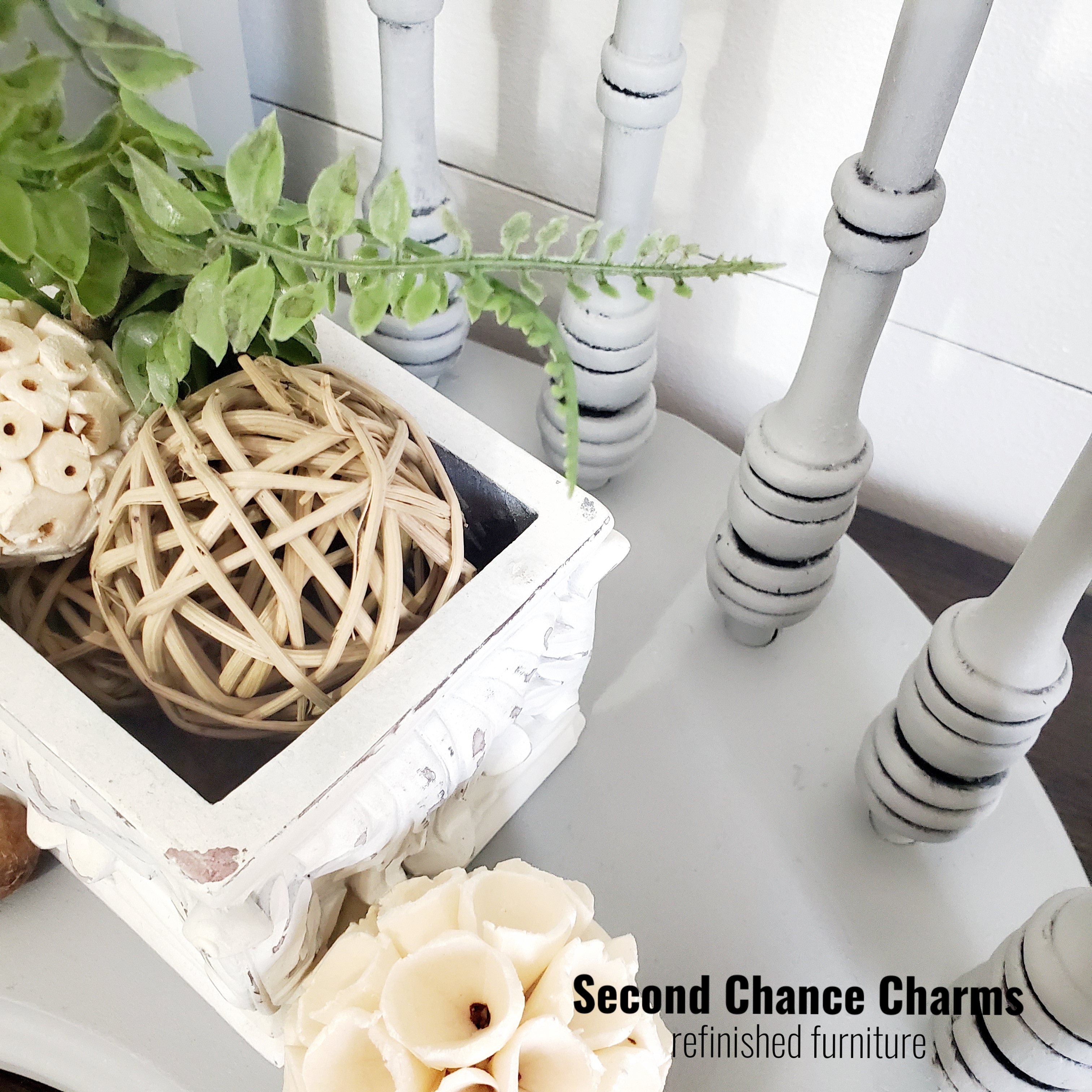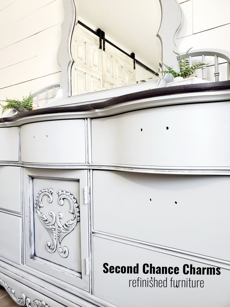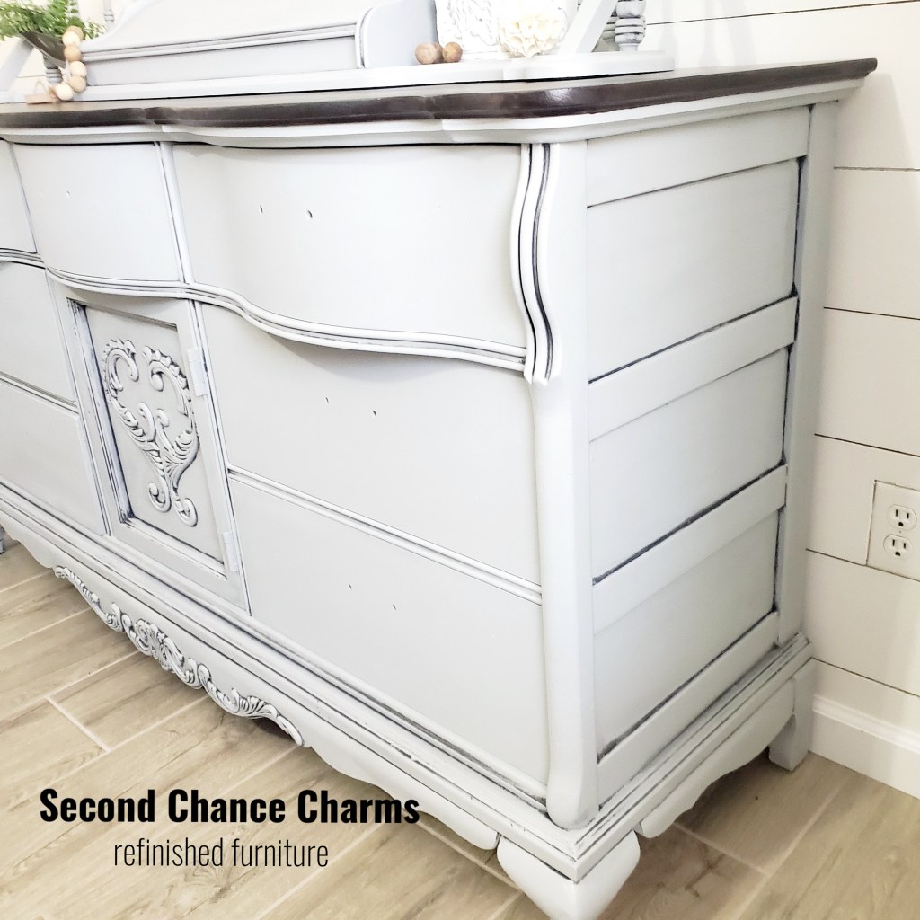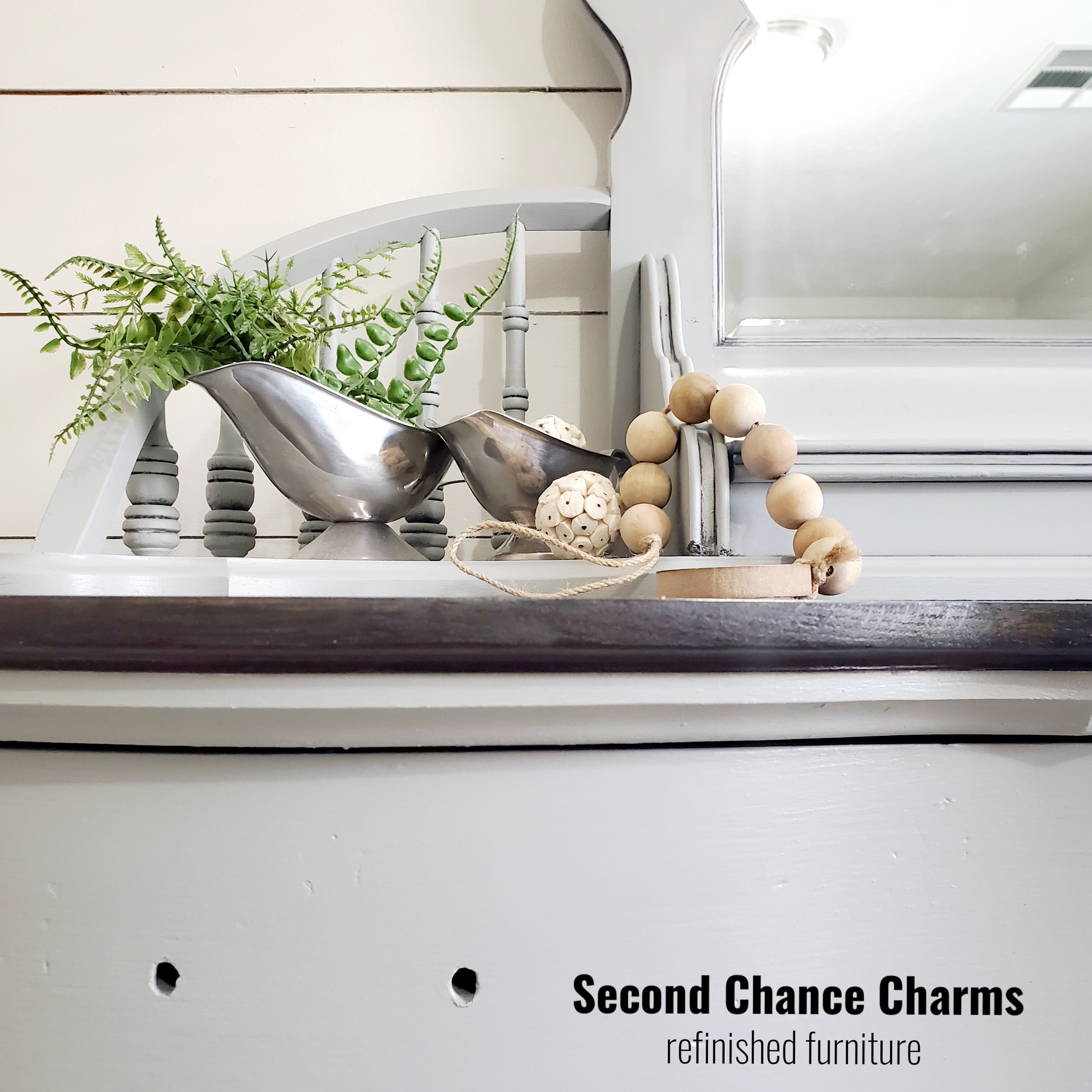 Nonetheless I will still stage her in all her beauty! Refinished in Sherwin-Williams Gray Matters and glazed in Cyberspace. I did not stain the top as my client was happy with how it was before, a beautiful dark finish. I did clean up a few troubled areas for her on the stain that was near the body of the piece.