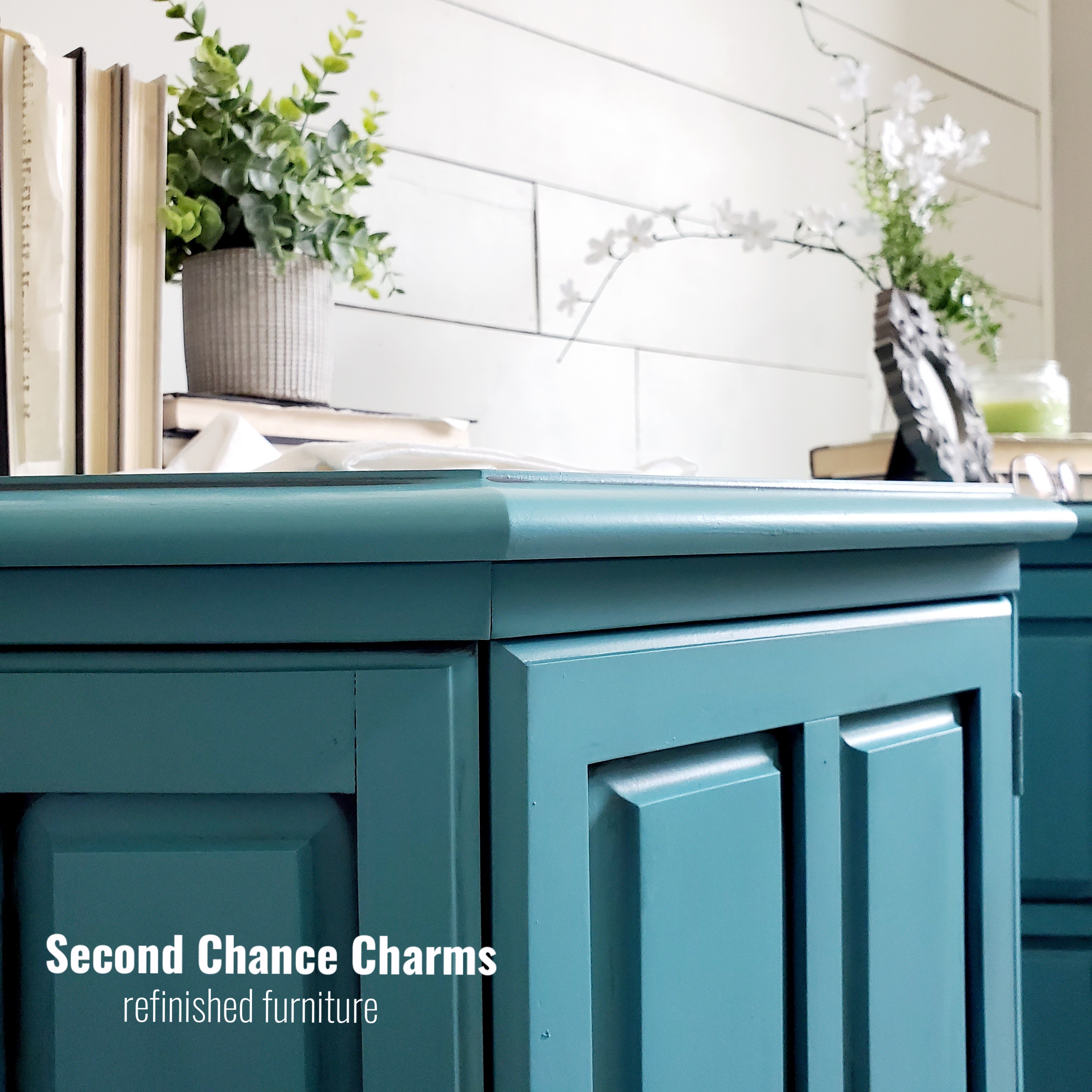 She wanted a pop of color in her family room and I am so excited for her! Refinished in Sherwin-Williams Cloudburst and glazed in Web Gray. Original hardware revamped in Oil Rubbed Bronze.
