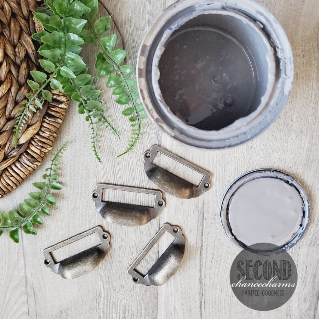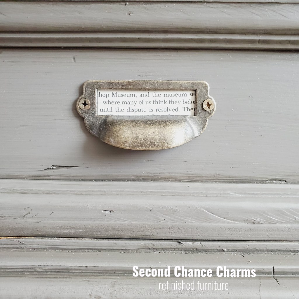 and glazed in Urbane Bronze. Hardware is brass library card catalog pulls that you can place tabs in or not. The top is stained using Weathered Oak with a grey wash.