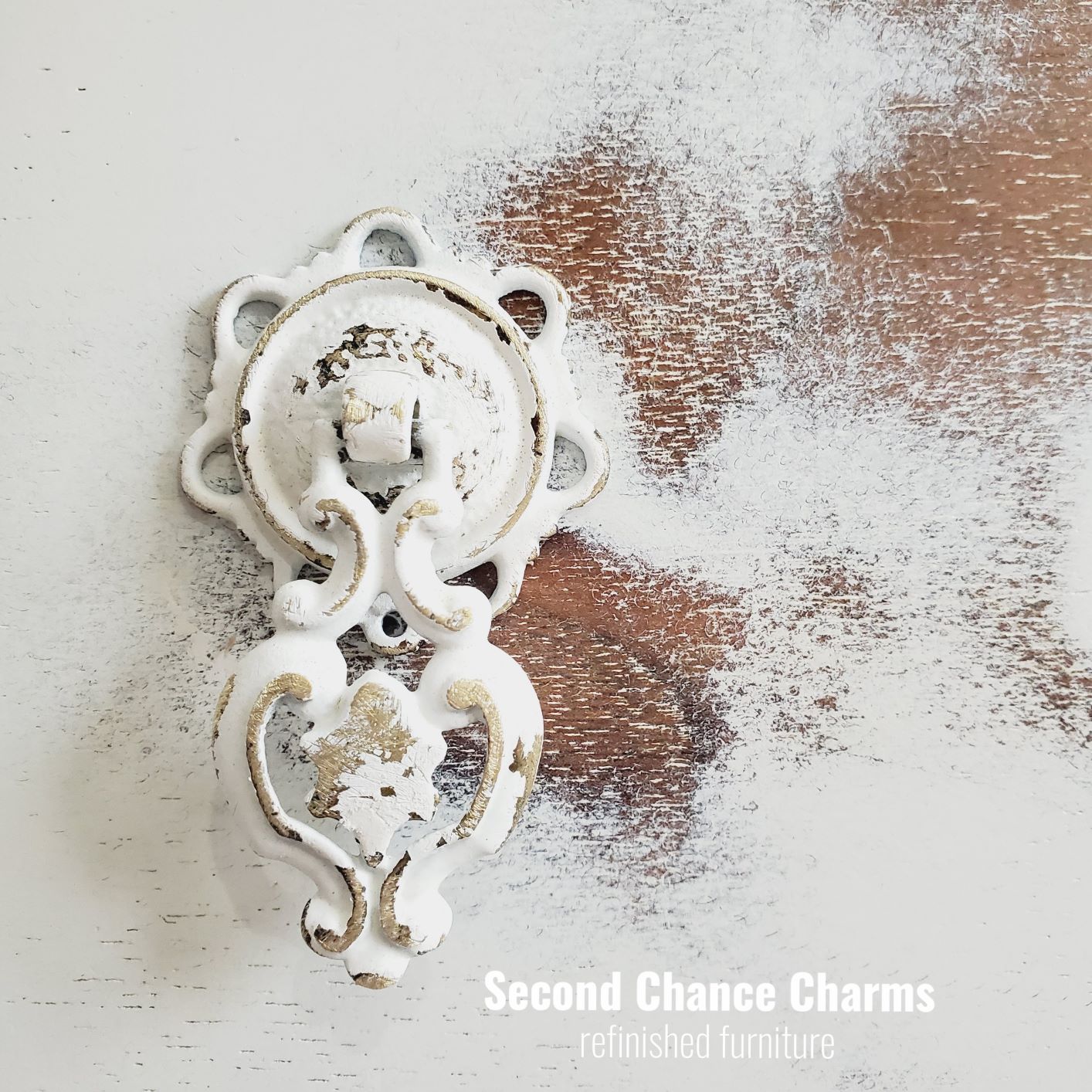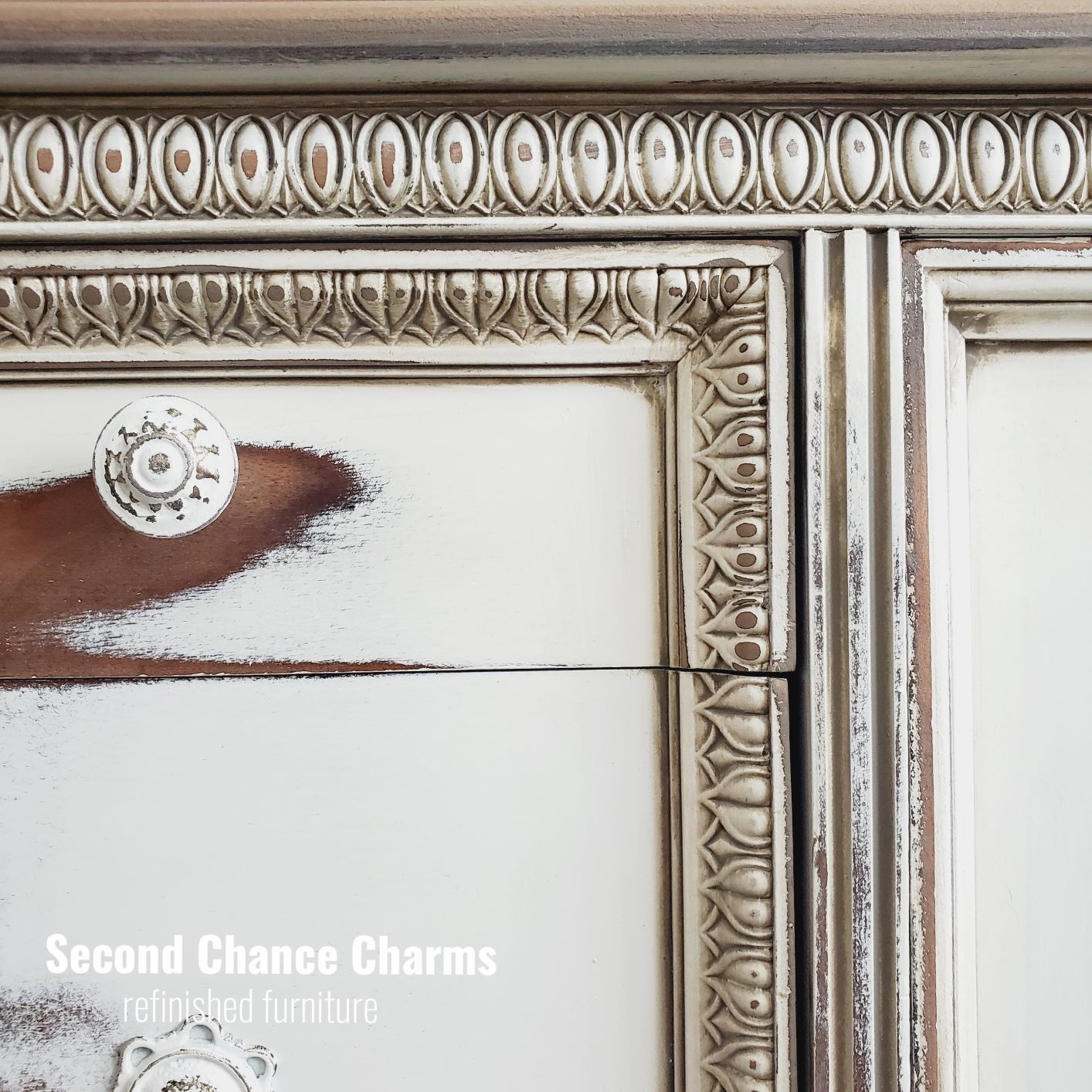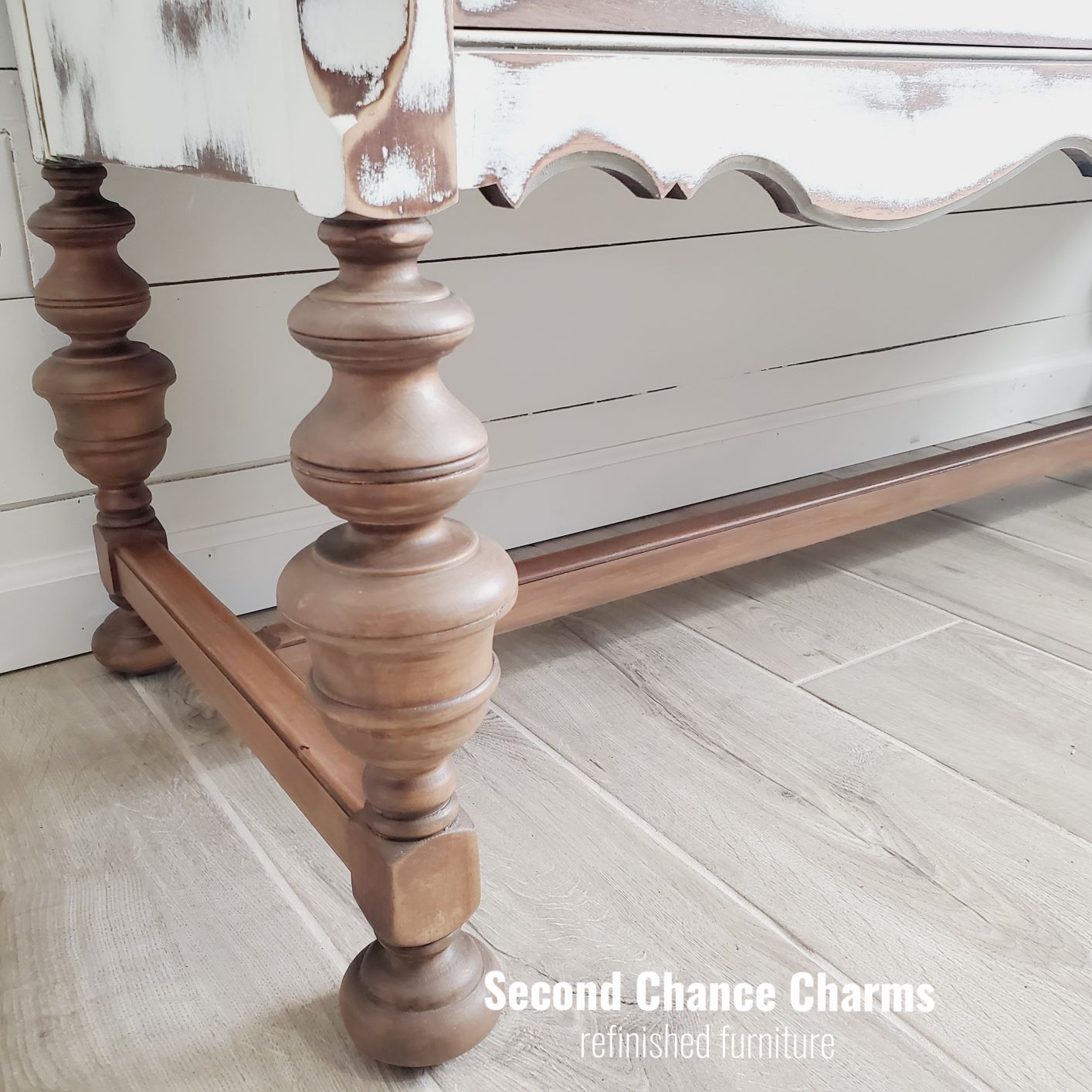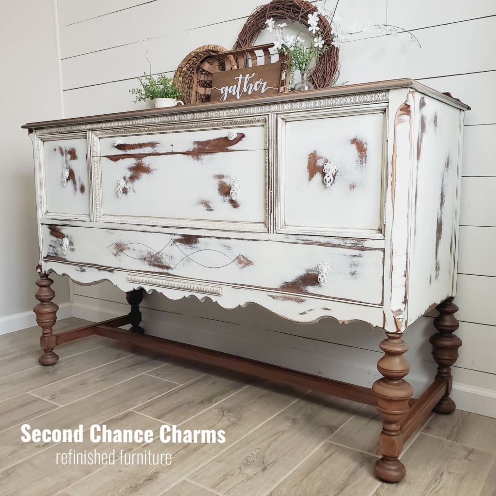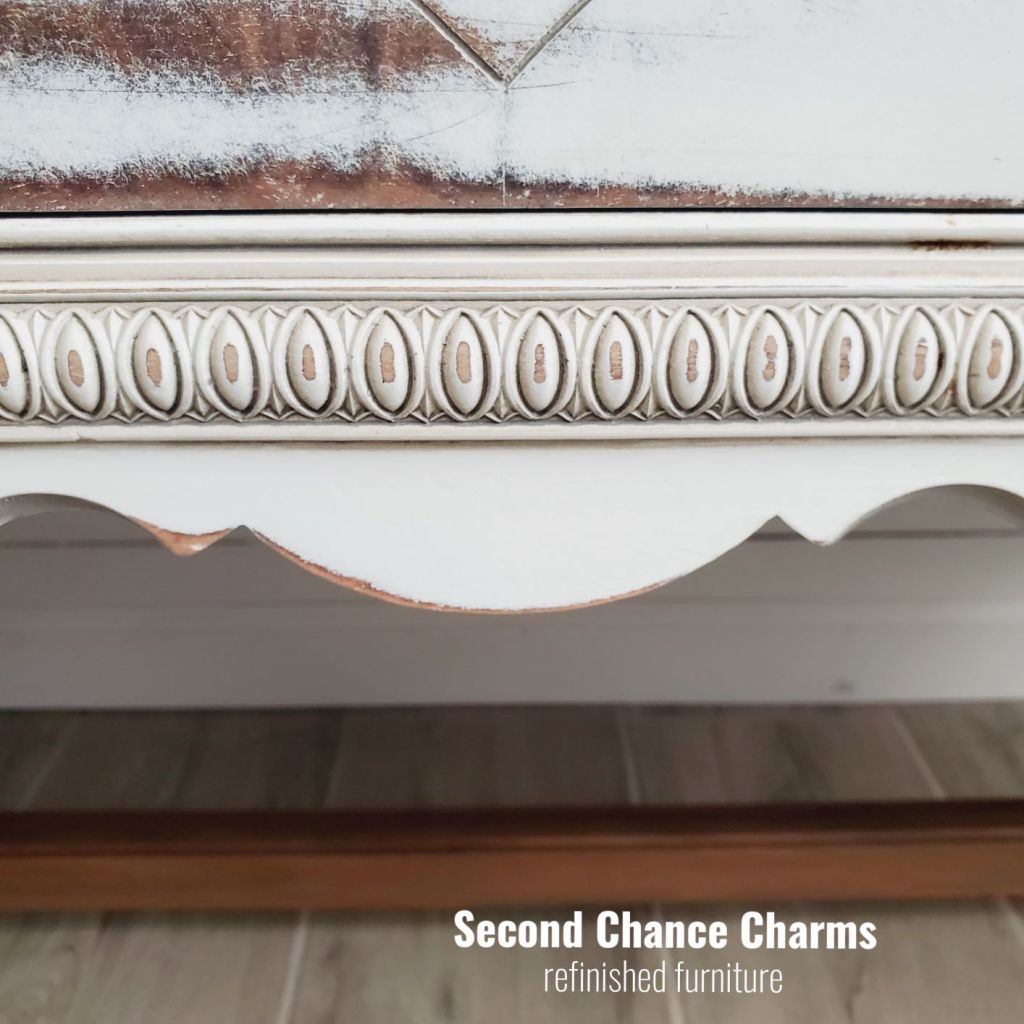 Refinished in Sherwin-Williams Greek Villa and distressed for a farmhouse charm! Glazed certain areas in Anonymous for a added pop in the details and to help soften her look. The legs and top along with the backsplash are all sanded down and sealed for a bare wood look. Original hardware revamped in white and wet distressed for added character.