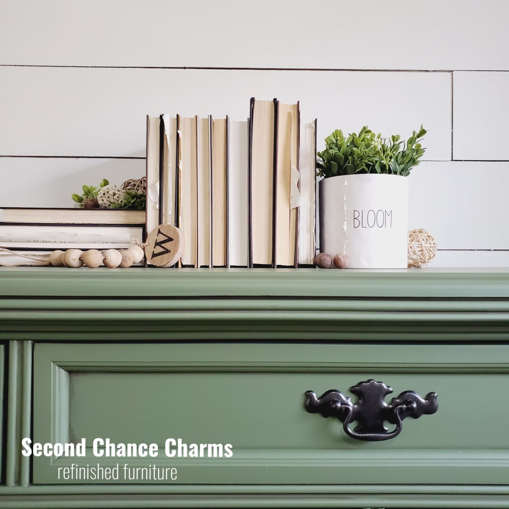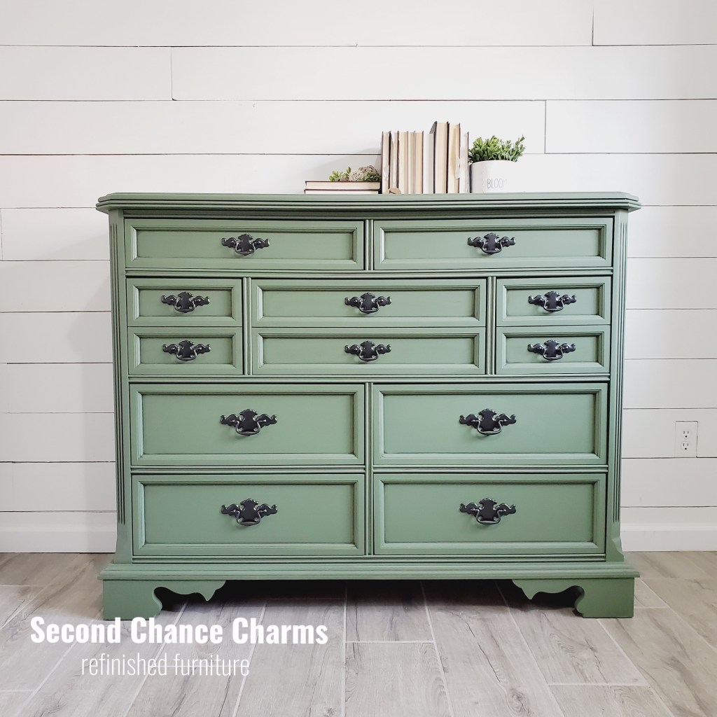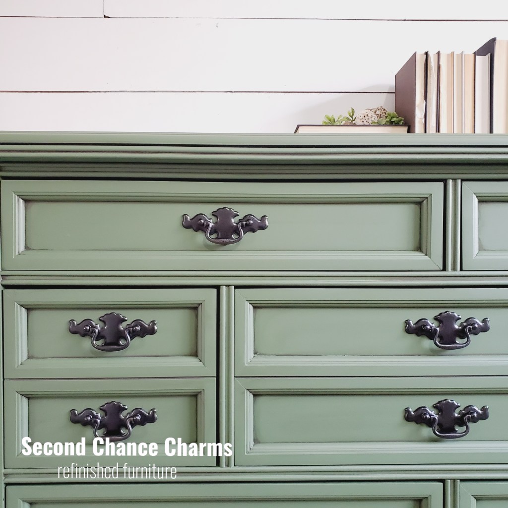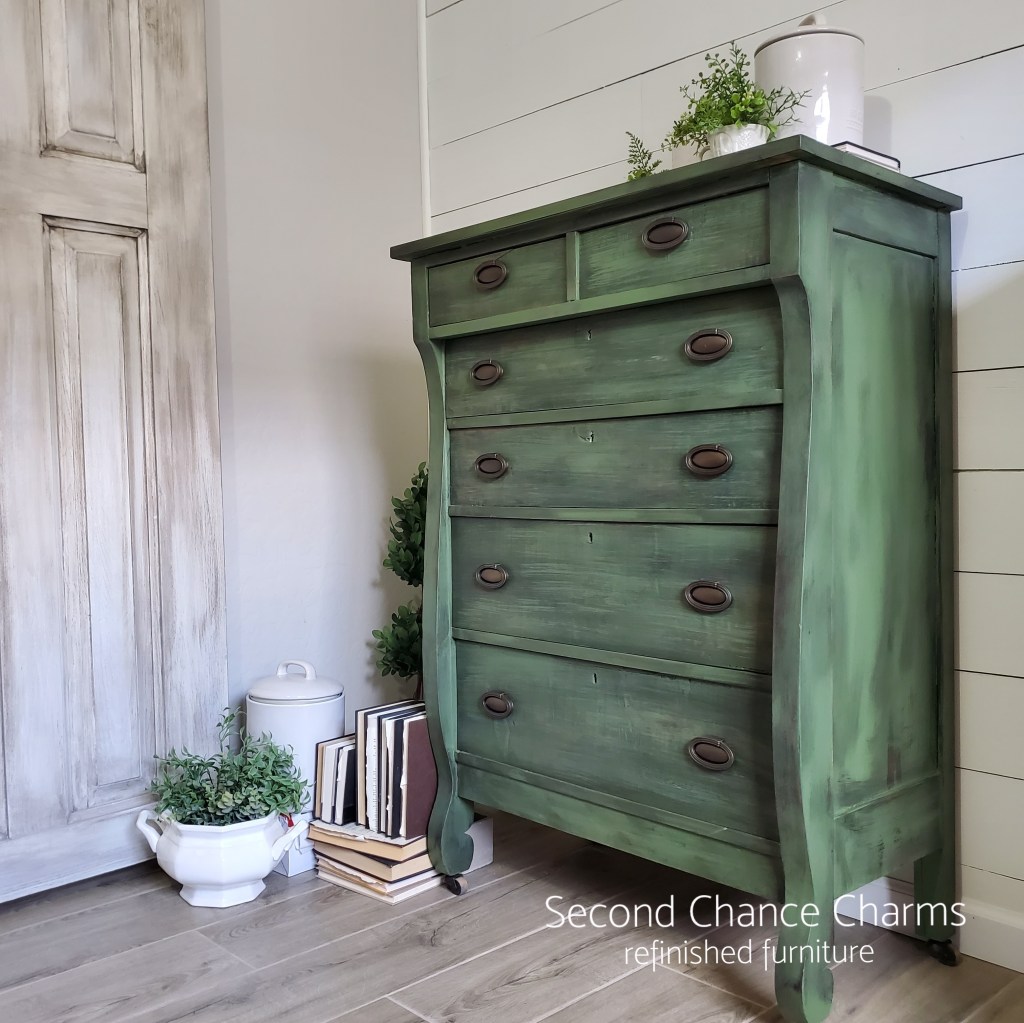 I got my hands on this stunning 1900’s antique dresser, sadly the original tiger wood faced drawers had seen better days. I ended up having to remove the old partly missing and very much chipped veneer and decided to give this beauty a true Second Chance! Changing directions from giving him a restoration I ended up wanting to see him in a green.
