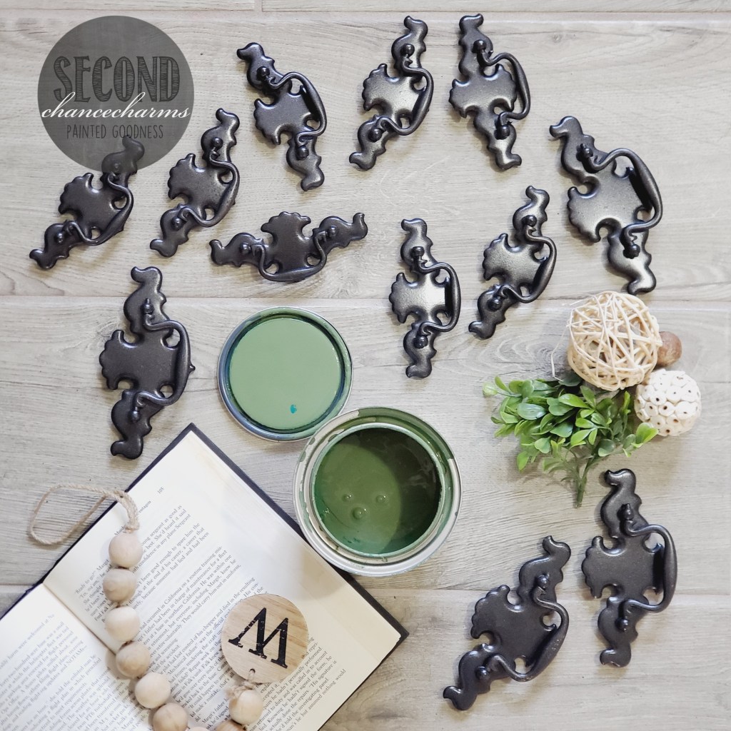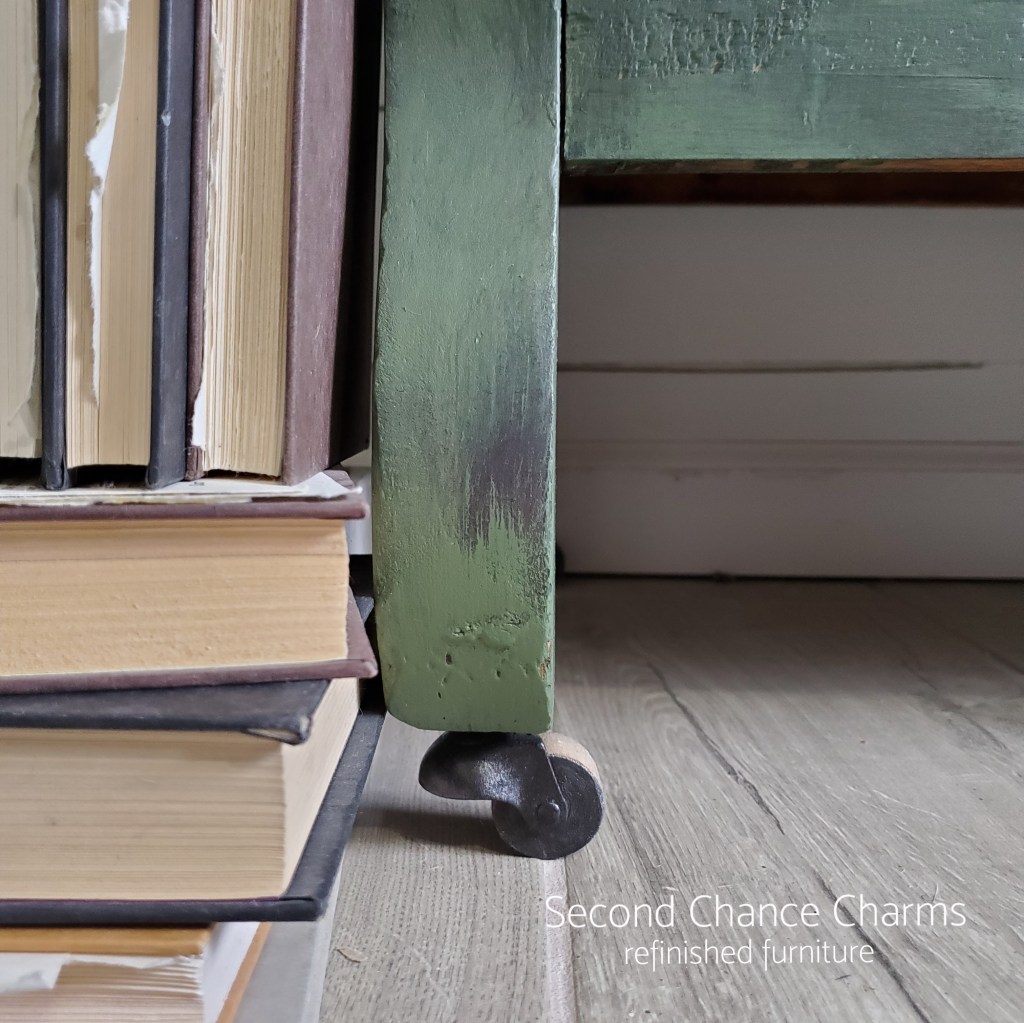 Refinished in Sherwin-Williams Oakmoss and heavily glazed in a dark brown slightly distressed in areas I saw fit for an aged look. Removing the original knobs and adding different pulls that I revamped in a Chestnut classed up this handsome fellow. I left his casters on, cleaned them up and refinished them in Chestnut as well for an overall makeover.