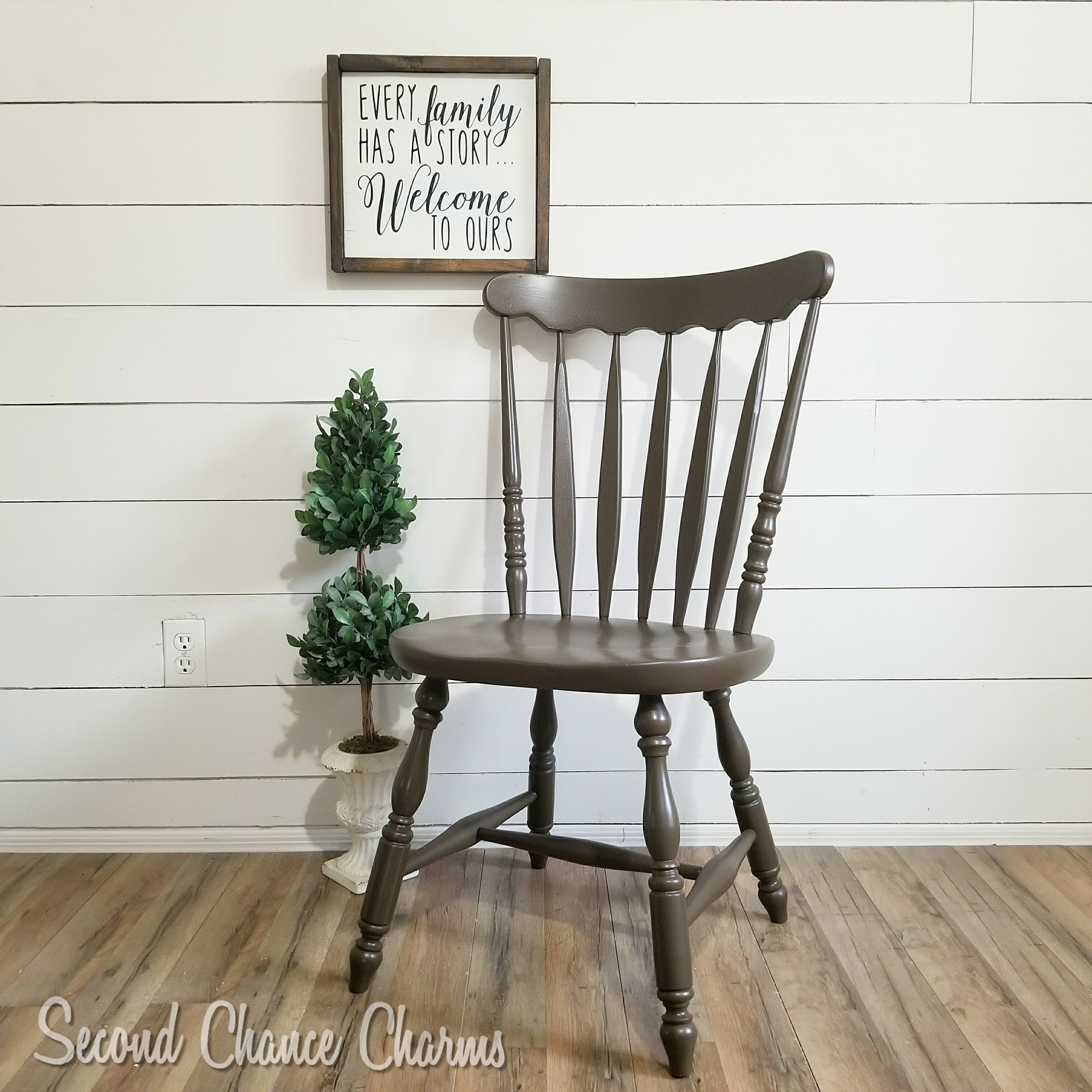 Refinished in Sherwin-Williams Software and glazed in Cyberspace. My client picked out a cream and grey damask fabric from Joanns Fabric Store. Finally adding a dark grey cord to match and to finish them off!