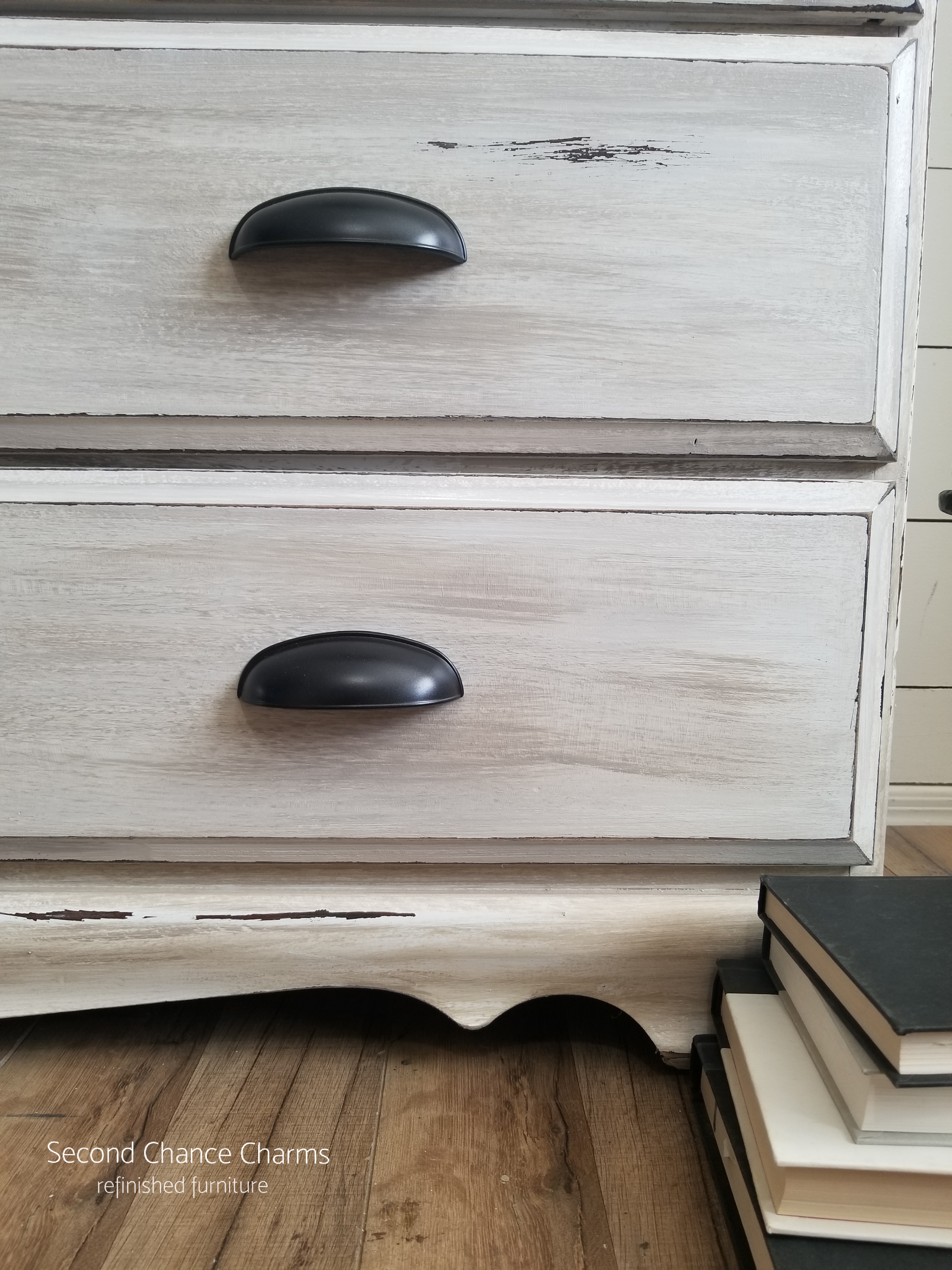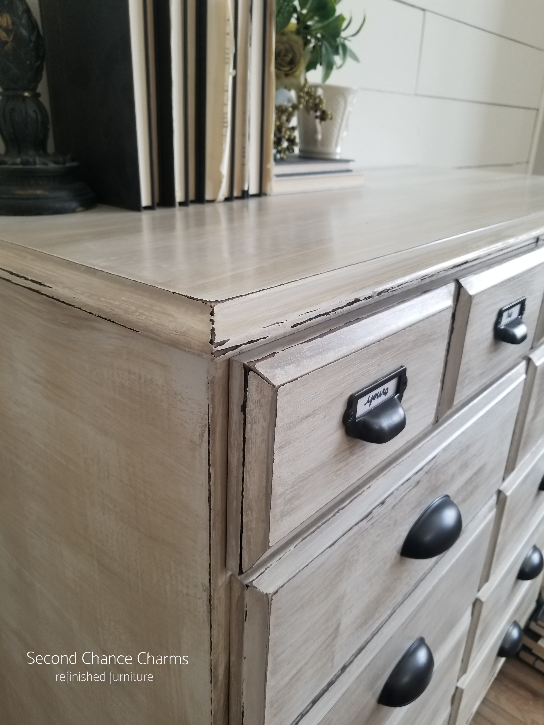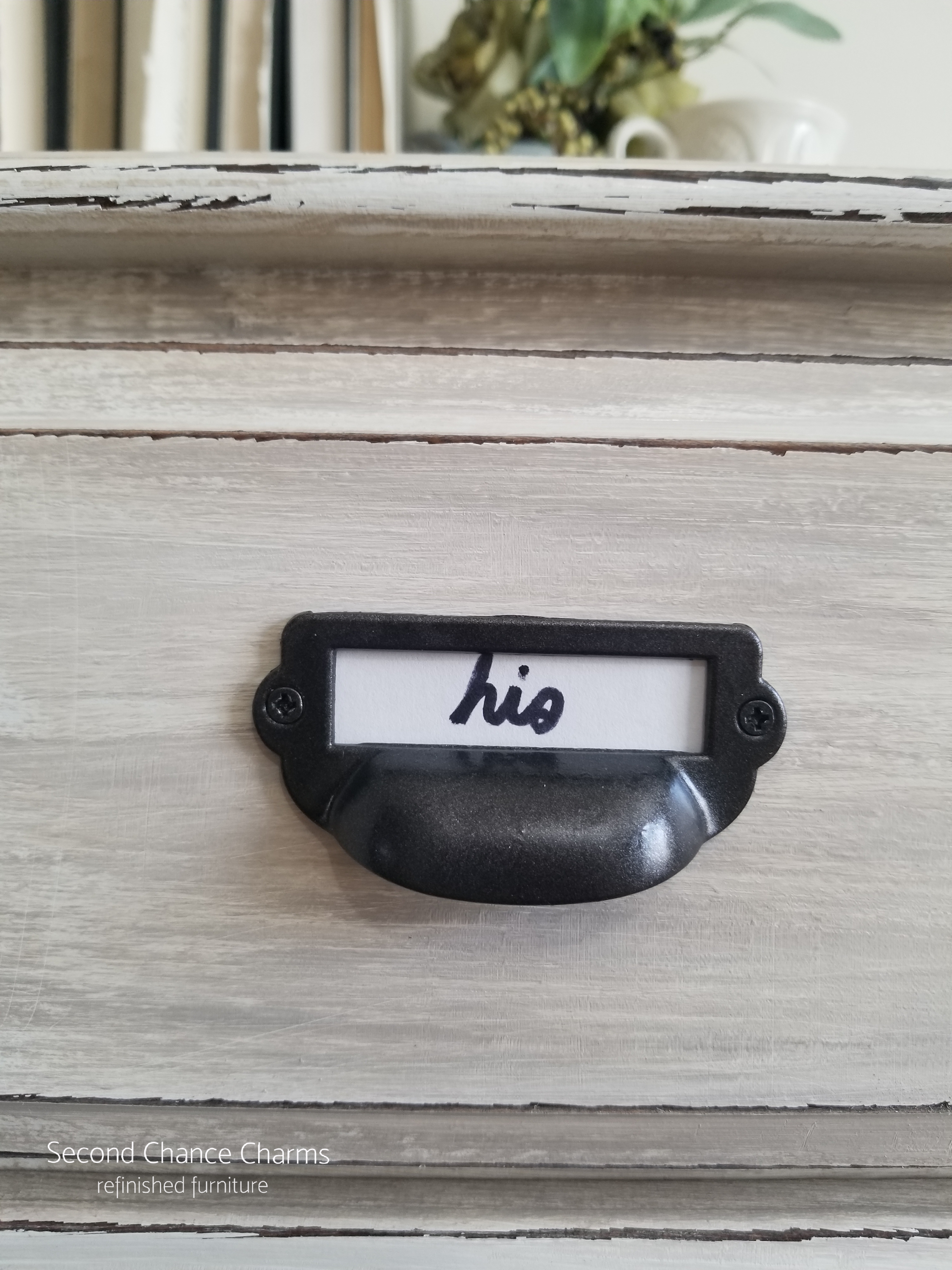 Refinished in a sold look using Sherwin-Williams High Hide White. Library card catolog pulls and some other handles that I reused from a clients piece that she no longer wanted, revamped in bronze.