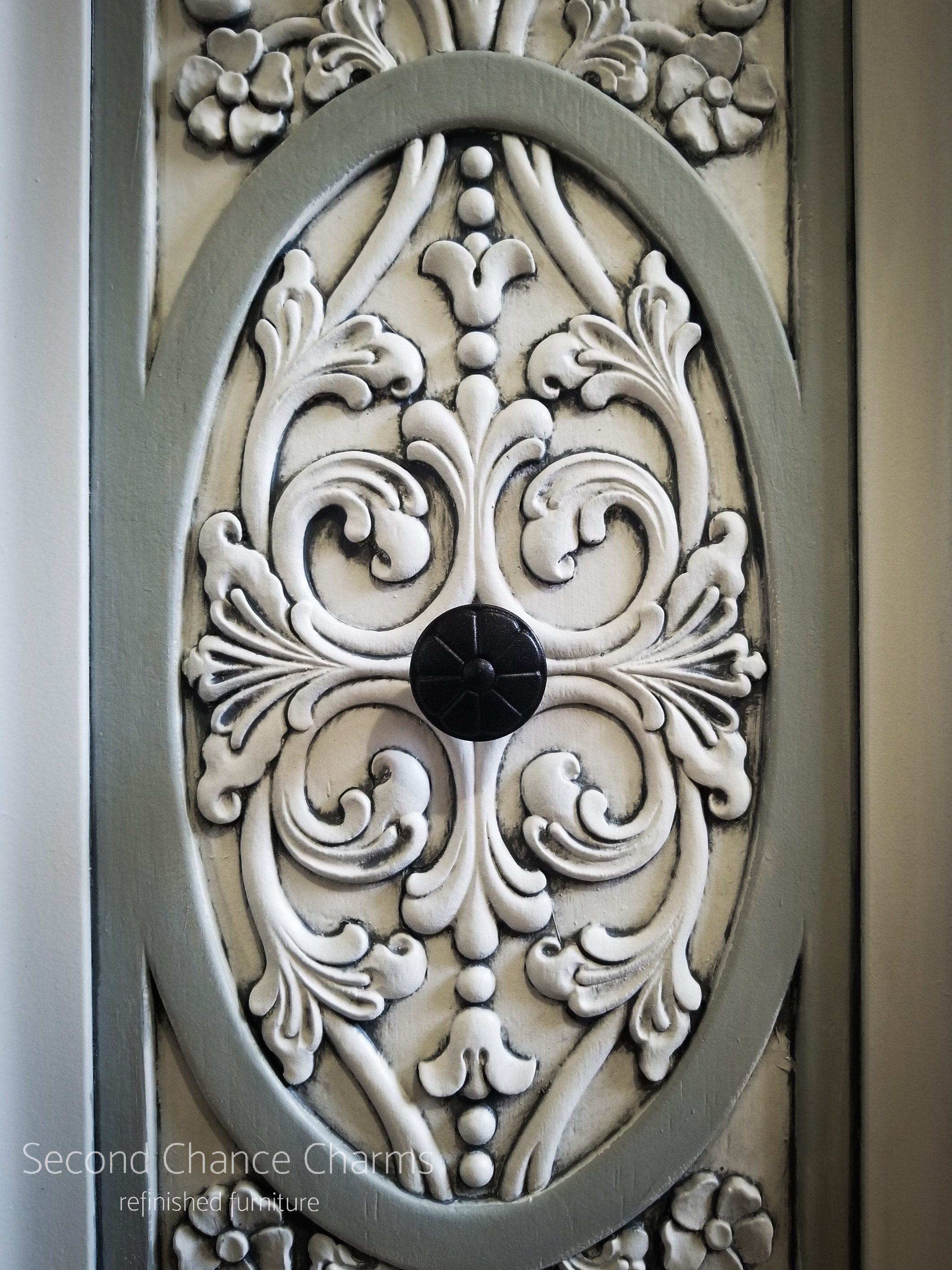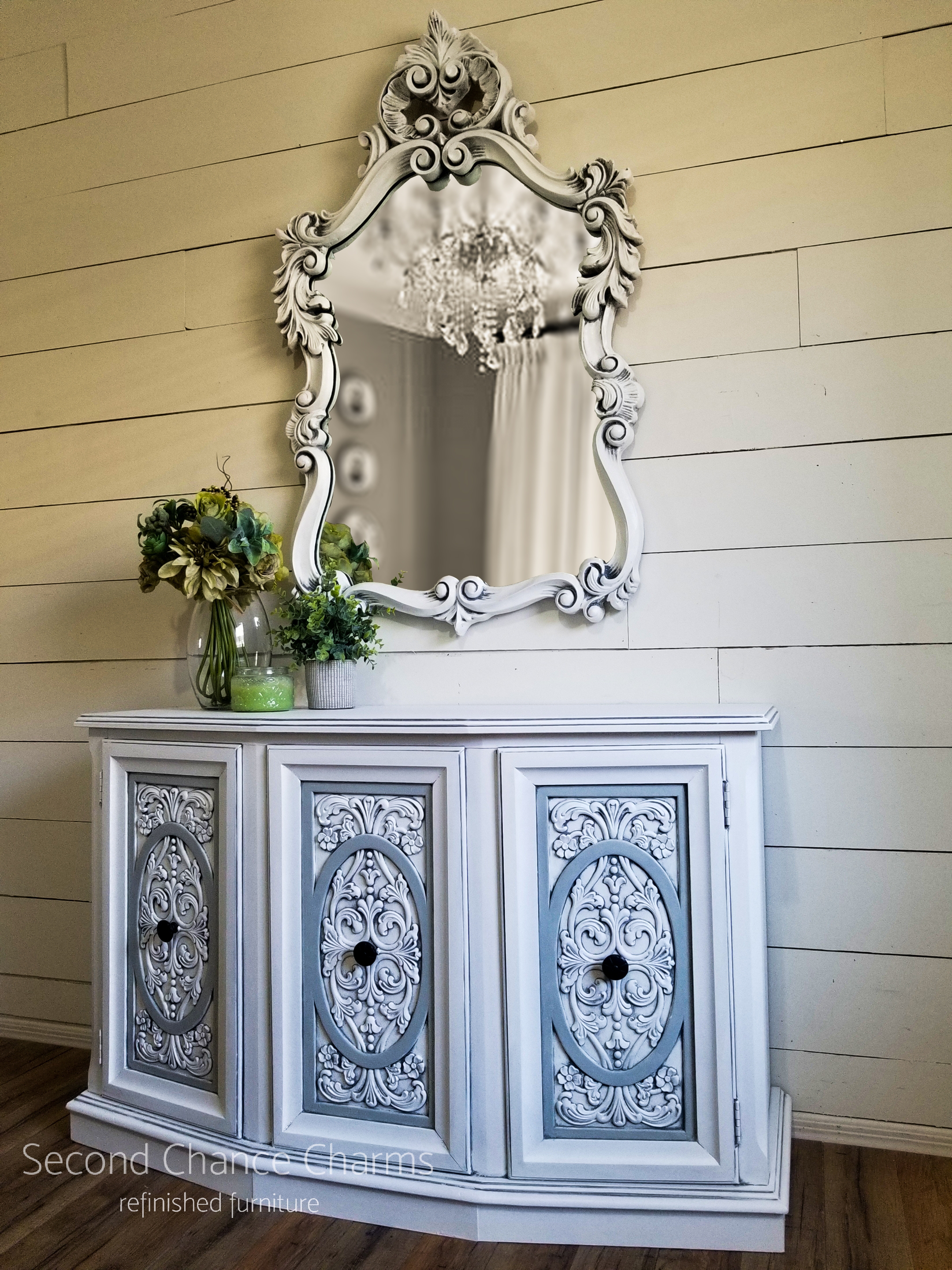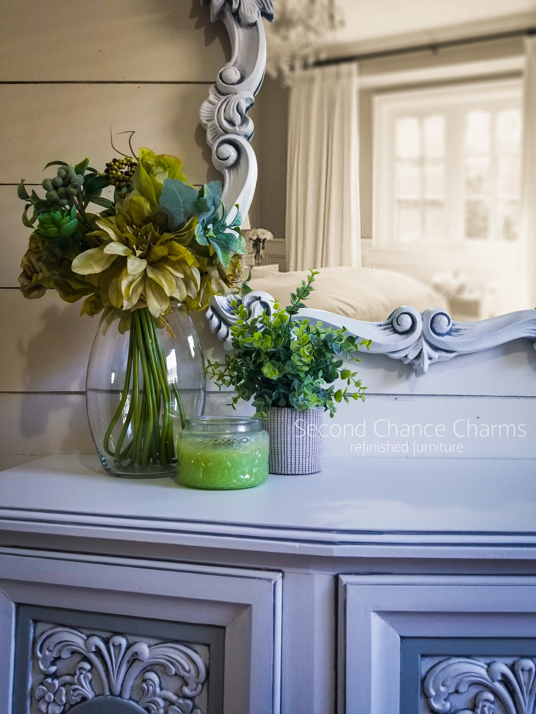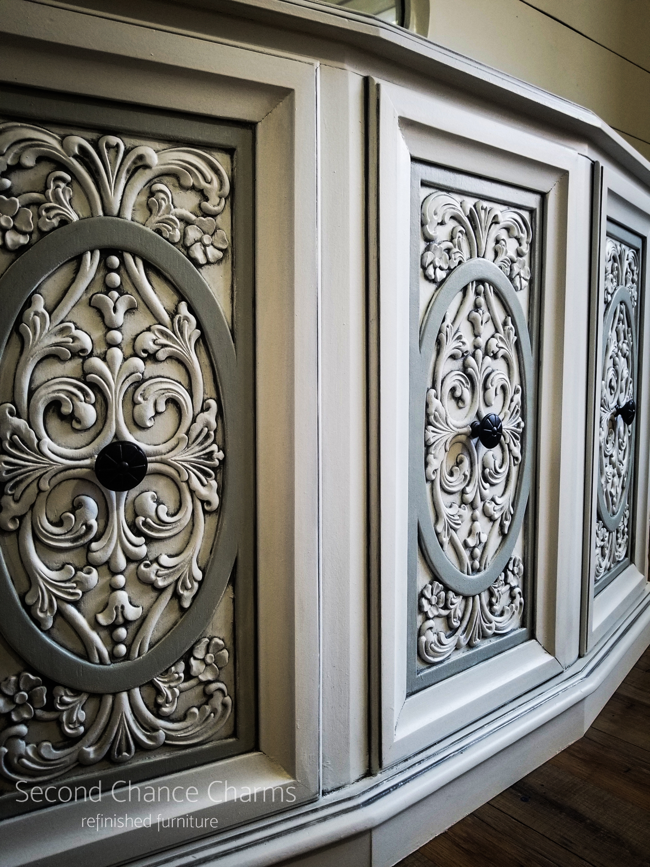 Refinished in a sold look using Sherwin-Williams High Hide White. Library card catolog pulls and some other handles that I reused from a clients piece that she no longer wanted, revamped in bronze.