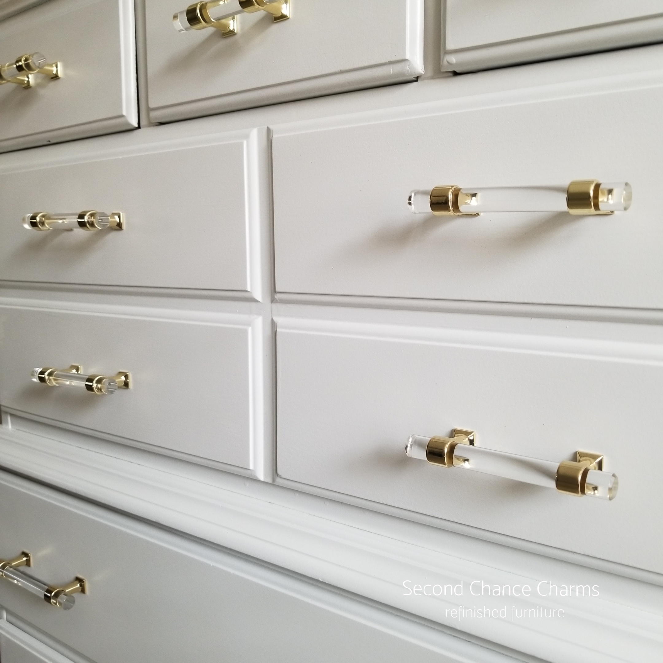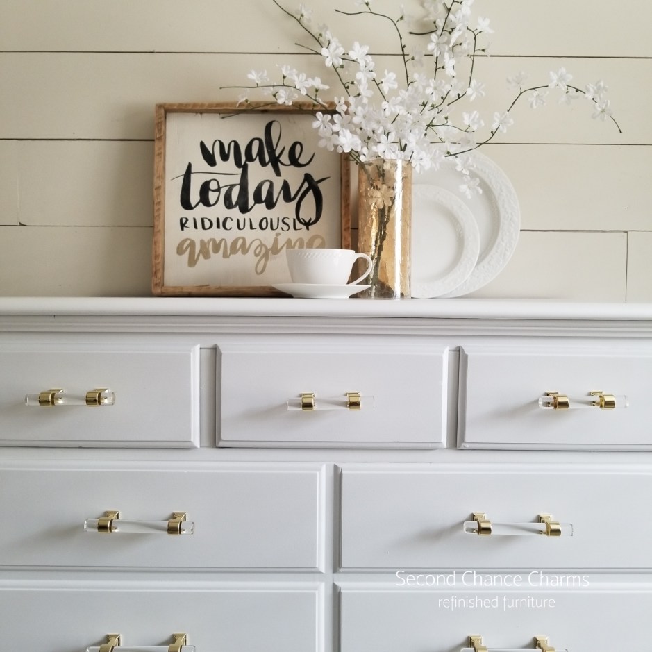 Refinished in Sherwin-Williams Greek Villa and lightly distressed in the lines. Top stained in Minwax Weathered Teak. Original hardware revamped in Oil Rubbed Bronze.