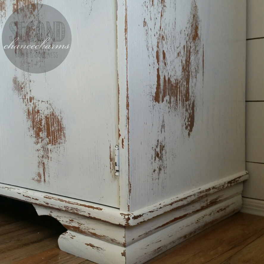 My new customer wanted the same look only more distressing! Refinished in Sherwin-Williams Alabaster and heavily distressed. Tops stained in Minwax Jacobean. Original hardware revamped in Oil Rubbed Bronze.