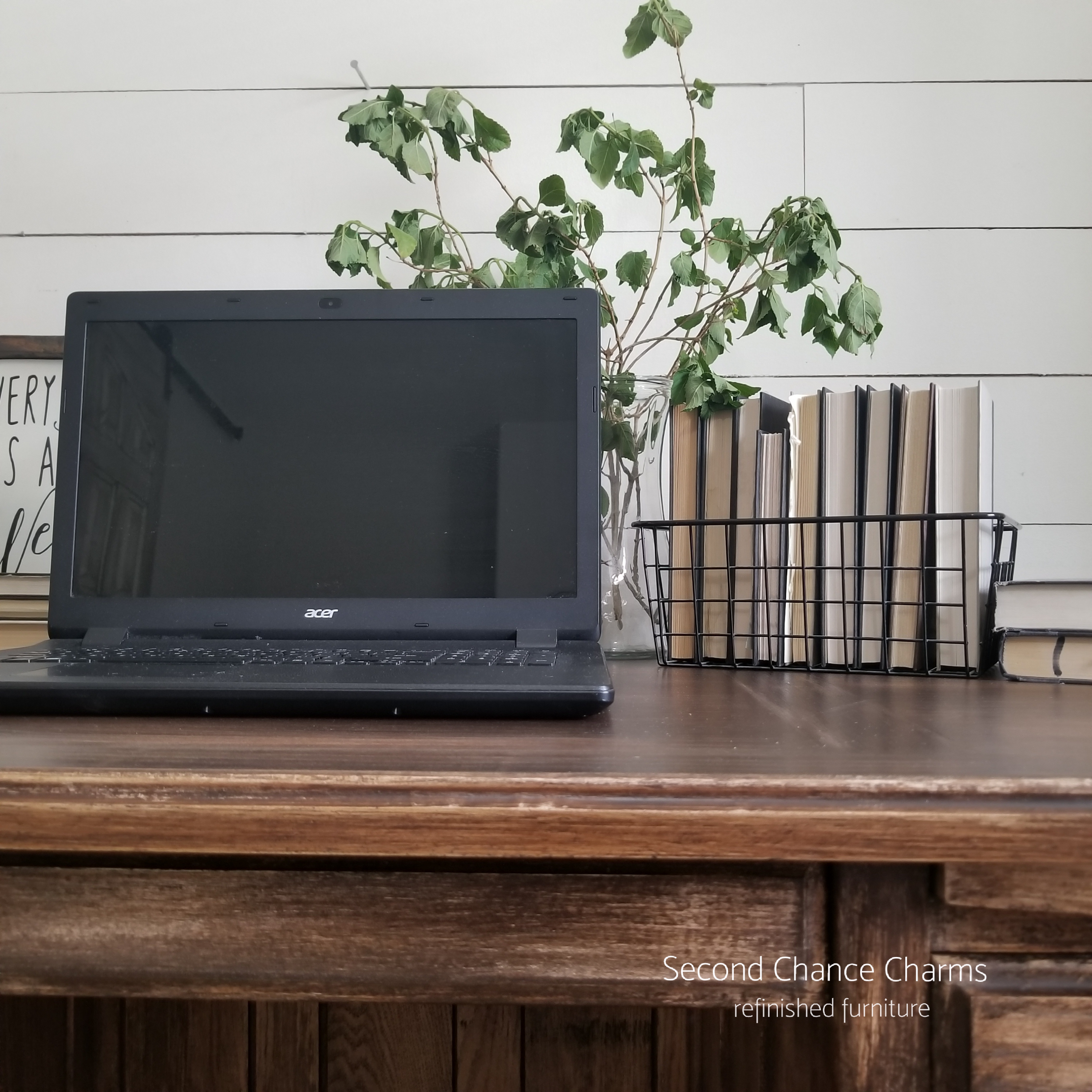My client matched her colors using Behr Paints color swatches and I had Sherwin-Williams color match those swatches in the products that I use. Refinished in Gem Silica, Honey Tea and Roasted Squash. The original hardware revamped in Oil Rubbed Bronze. I refinished the inside of the desk in Gem Silica for a surprise POP of color. Using Honey Tea and Roasted Squash I did a blunt blending in a horizontal line that matches her bedroom furniture. Distressed the entire piece to help give a finish blend as well as tie this piece in with the other pieces this little lovie will be sharing space with.