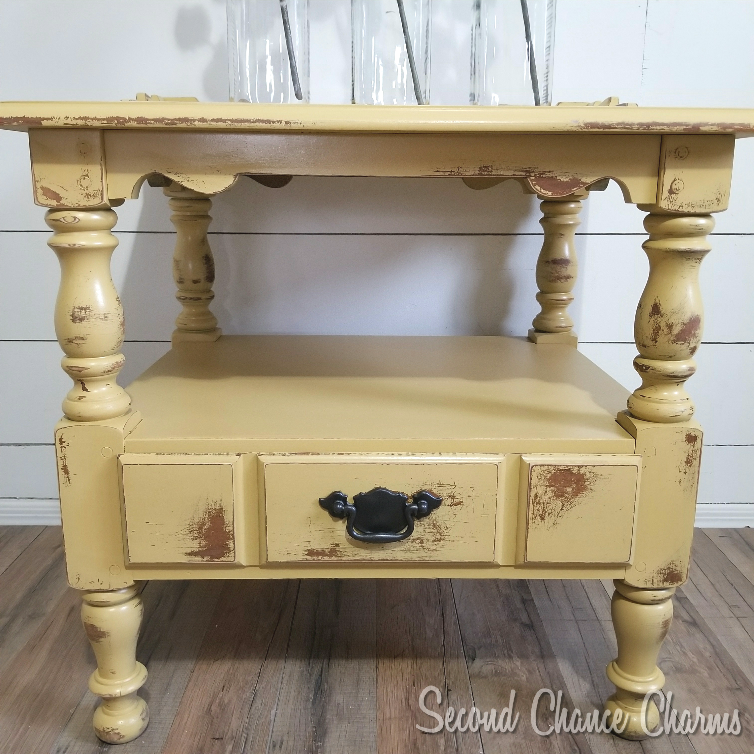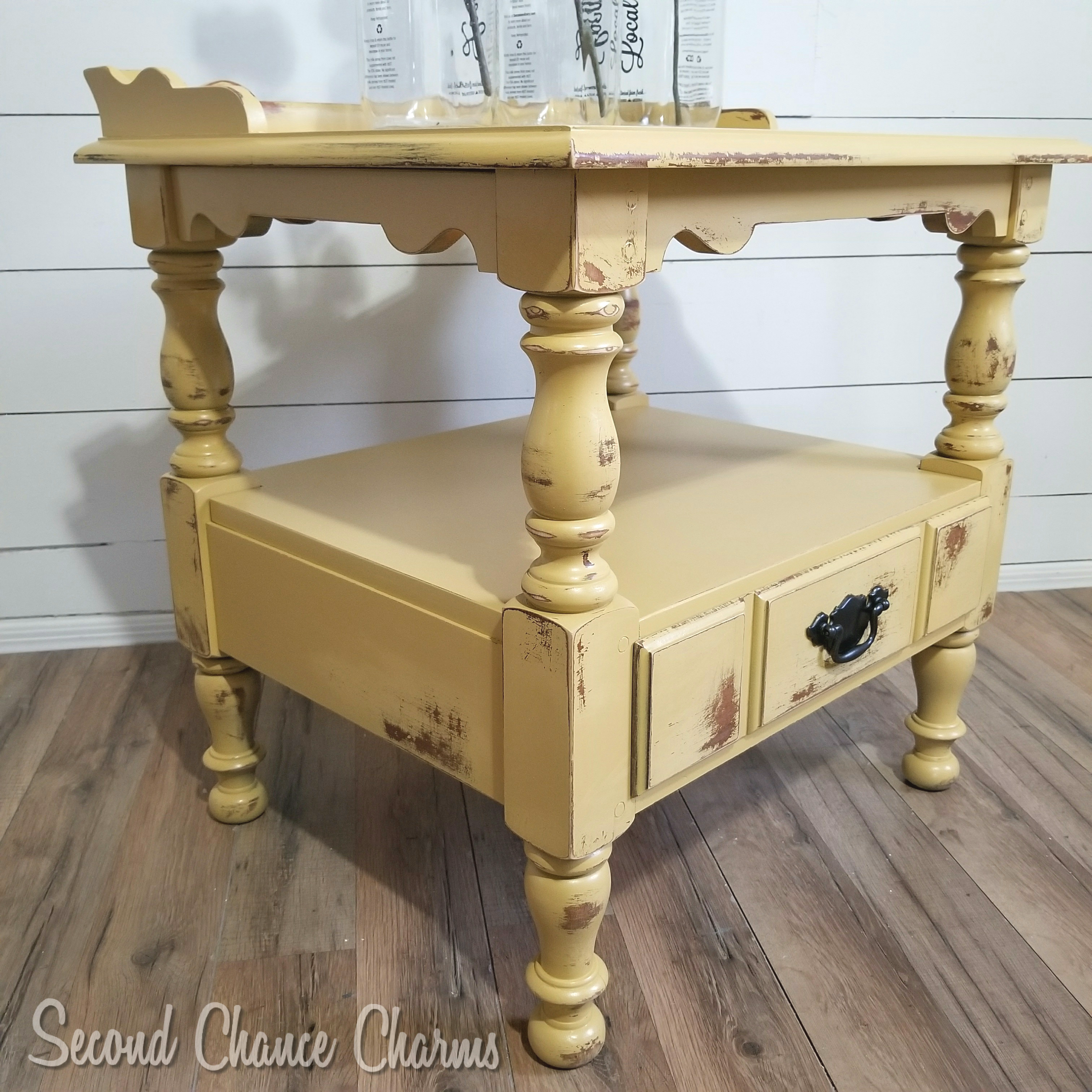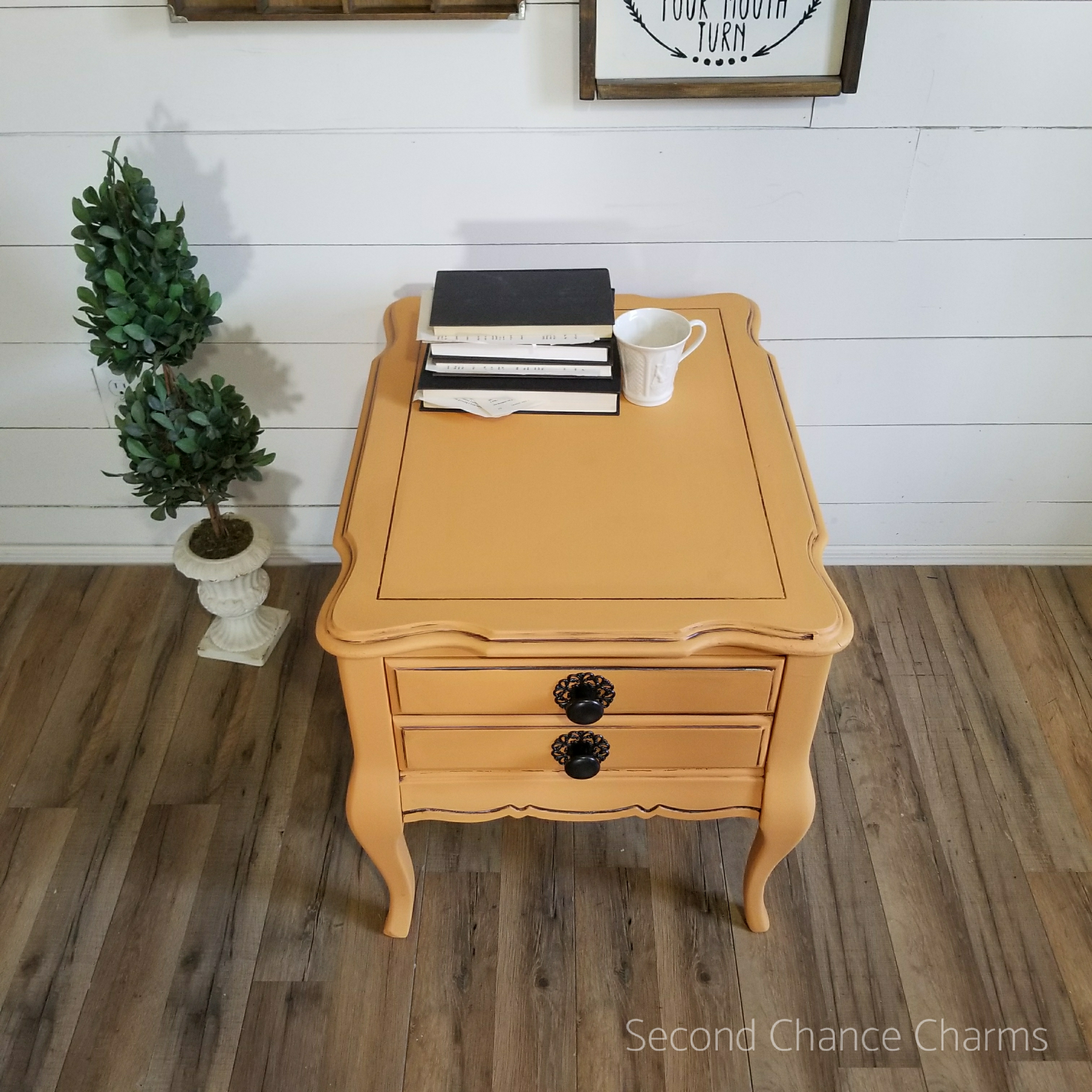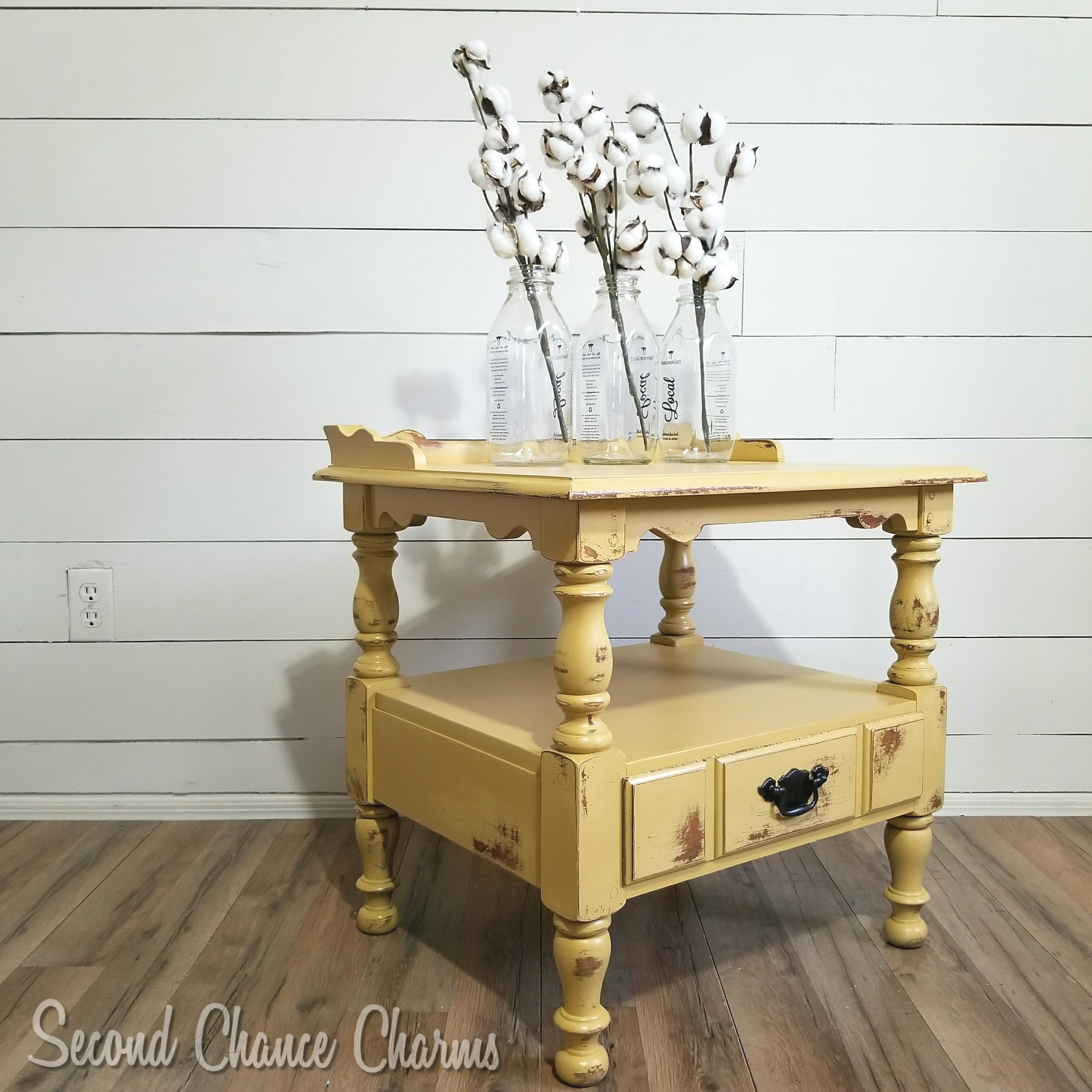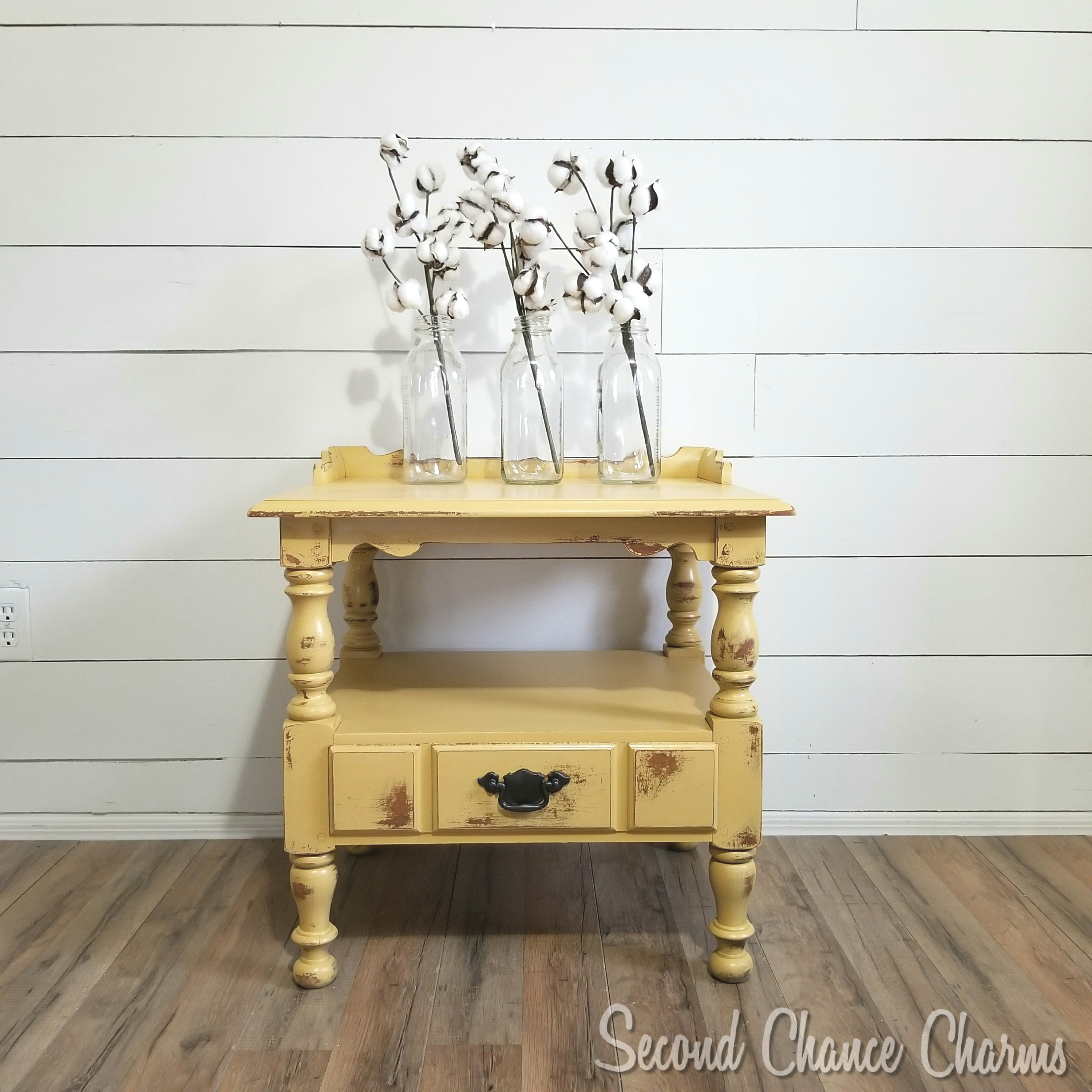 Yellow mellow and a perfect friendly fellow! Refinished in Sherwin-Williams Butternut. Distressed to perfection for the farmhouse chic look. Original pull revamped in oil rubbed bronze.