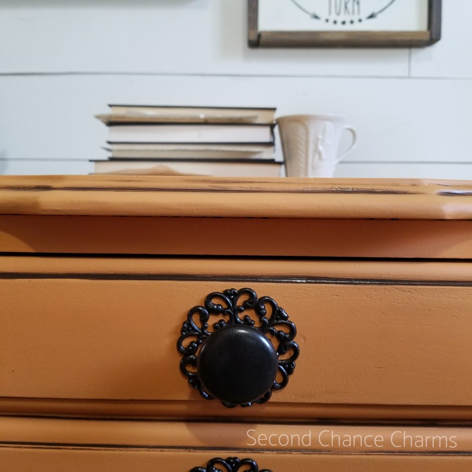 Refinished in Sherwin-Williams Tangerine and lightly glazed in Turkish Coffee brown. Hardware revamped in bronze.