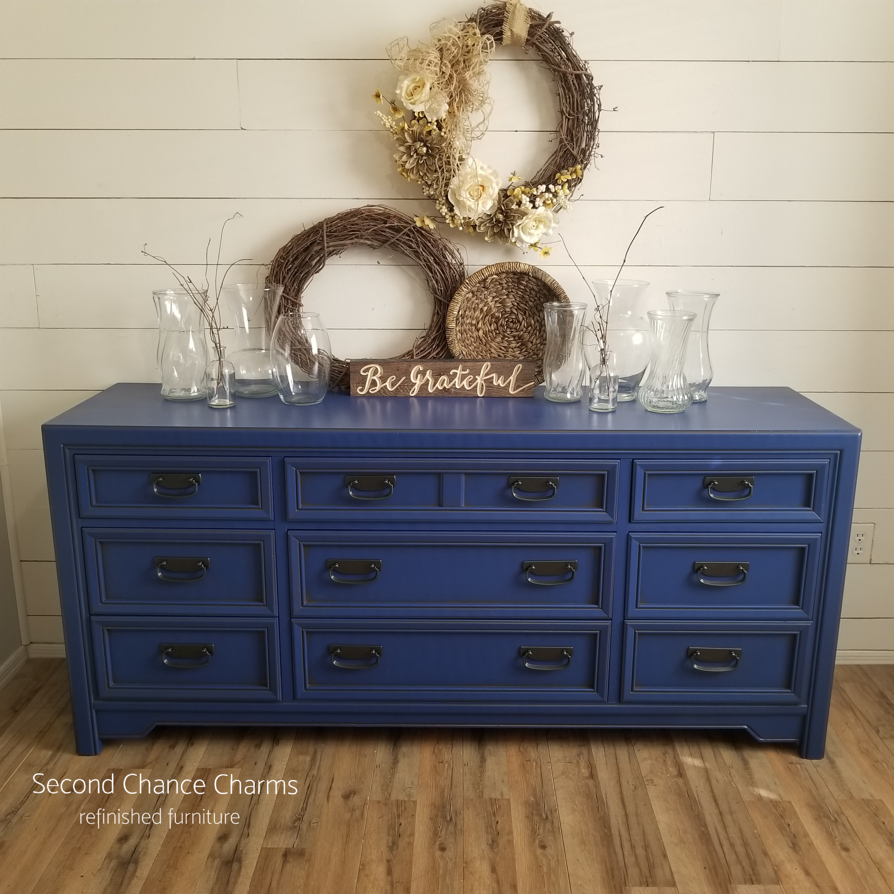 Refinished in Sherwin-Williams Indigo. Glazed in my favorite brown color for a sleek gorgeous pop in the details. Original hardware revamped in oil rubbed bronze.