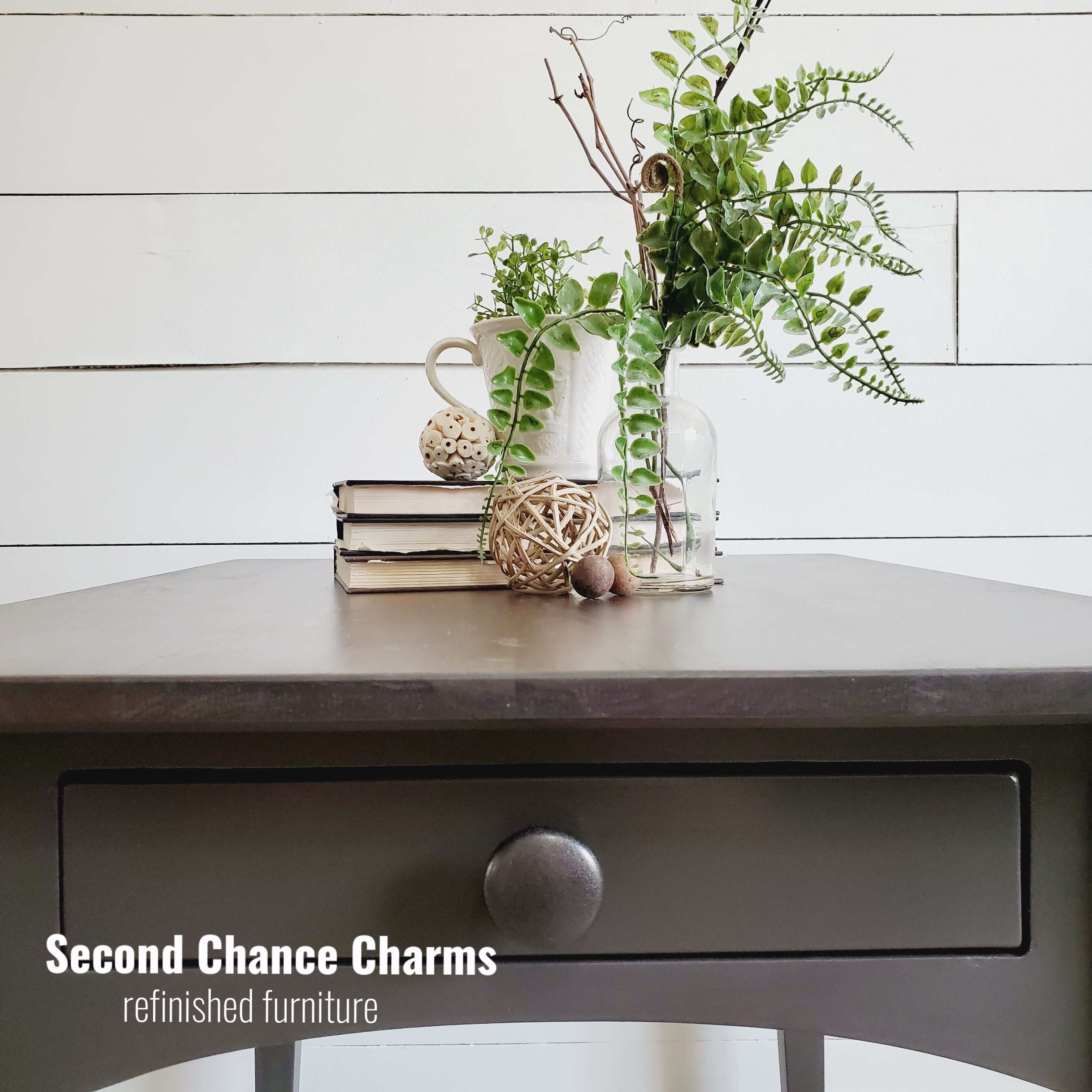 Refinished in Sherwin-Williams Black Fox and lightly distressed. Tops are stained in Minwax Pecan.