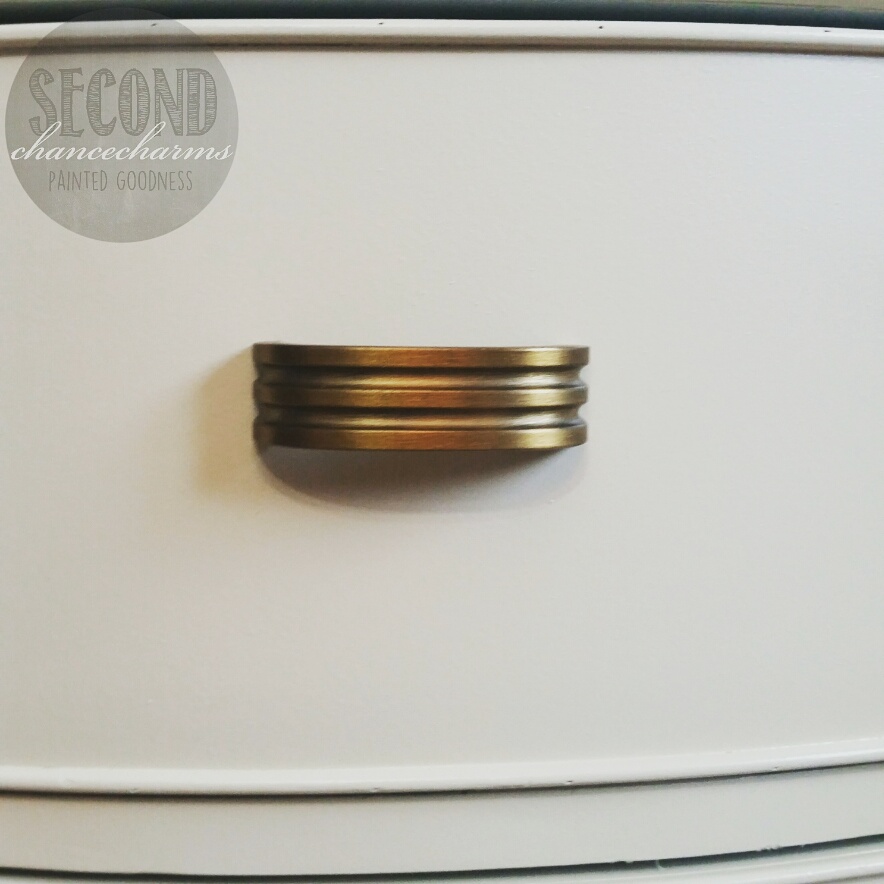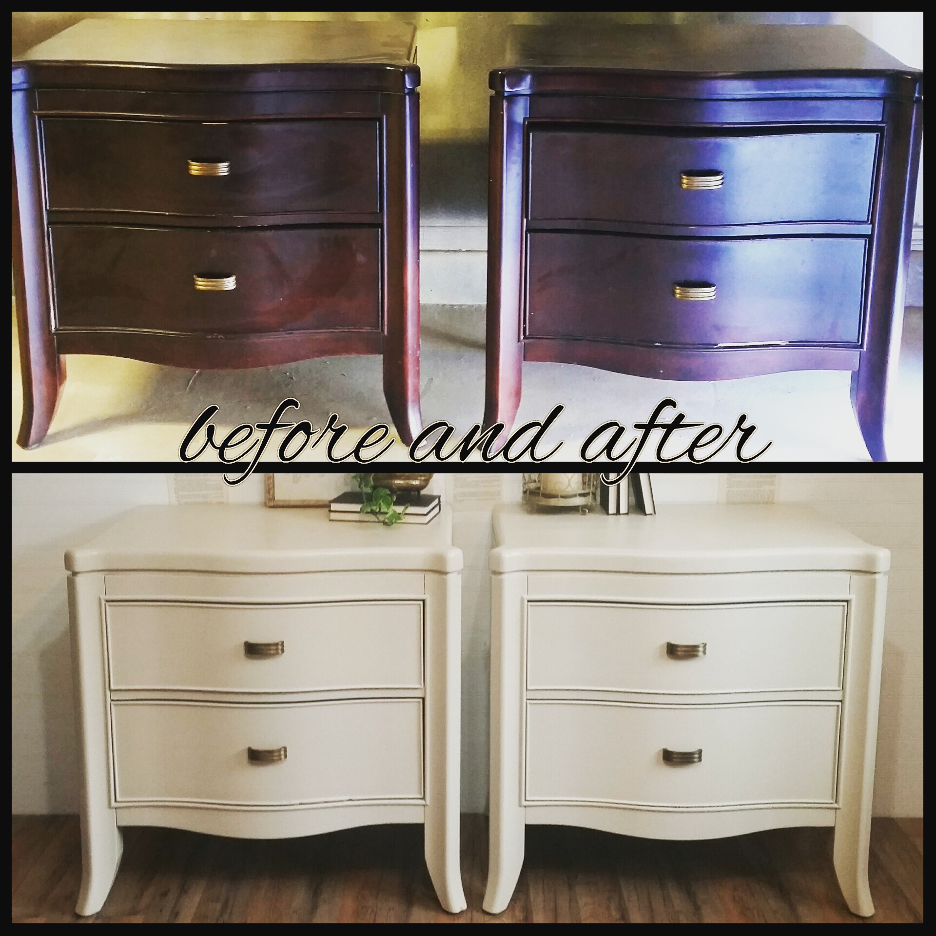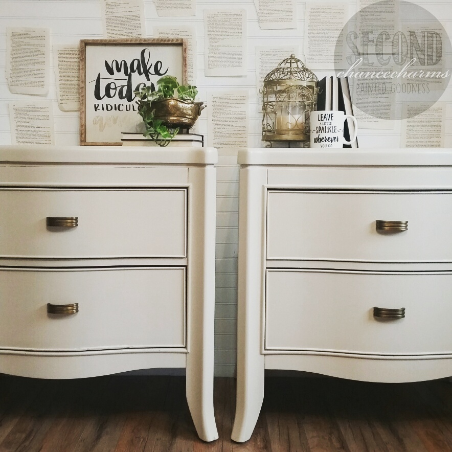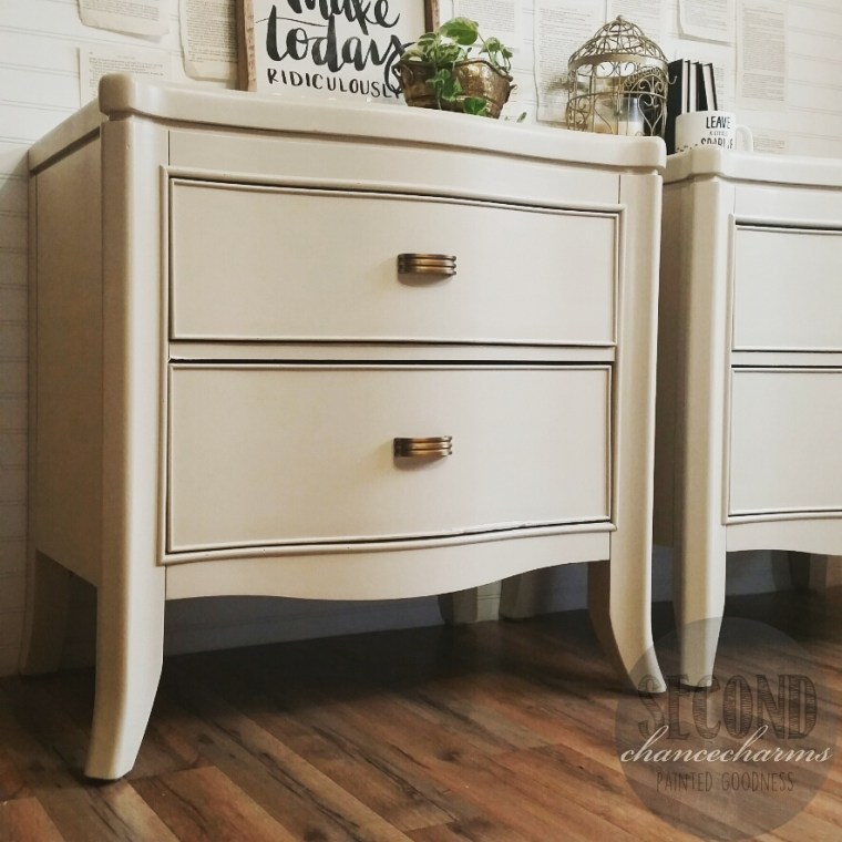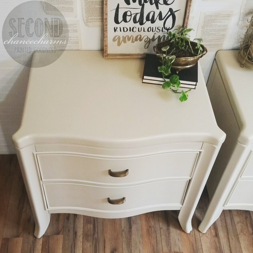 You can find used furniture for sale on social media outlets.  For example, facebook swap pages are most of my clients favorites!  They will tag me in pieces they want and I do the leg work of picking it up for them. This was one of those cases. My client tagged me in two nightstands and dresser. Refinished in Sherwin-Williams Sand Beach and original hardware polished. Such a sleak simple look that will give sparkle to her space!