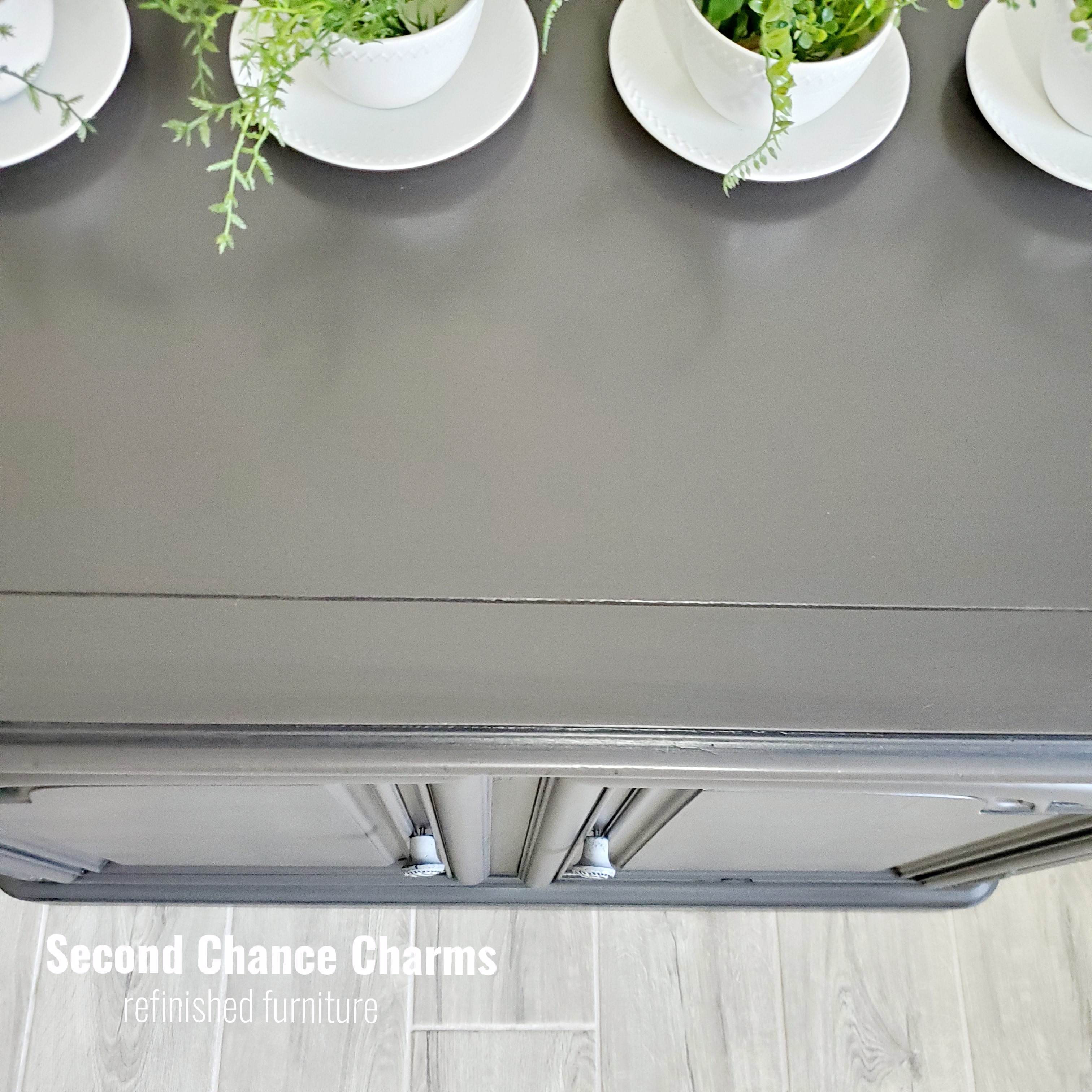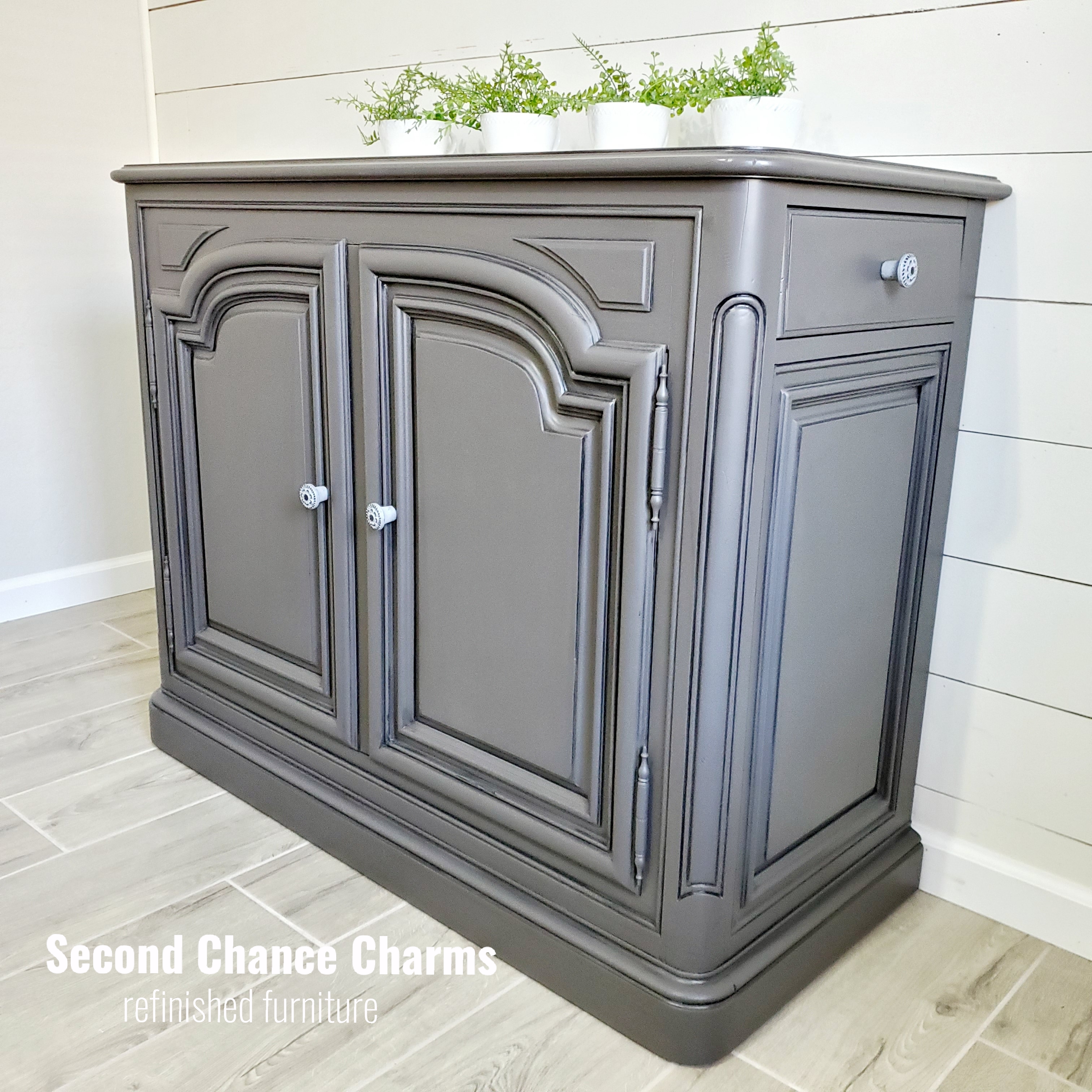 I absolutely love this color grey- it’s a beautiful masculine color that exudes sophistication and style, making it perfect for anyone looking to elevate their living space. Refinished in Sherwin Williams Urbane Bronze, this piece showcases a deep, rich hue that is both modern and timeless, seamlessly blending with both contemporary and traditional decor. With these streamlined angles and straight edges, I felt compelled to ensure that the base and legs were the center of attention, drawing the eye and creating an impressive silhouette that commands presence in any room. Sanding them down meticulously and sealing them for a natural look was exactly what I envisioned; this process not only highlights the craftsmanship but also enhances the overall appeal, making it an exquisite addition to any decor that speaks to those who appreciate quality and elegance.