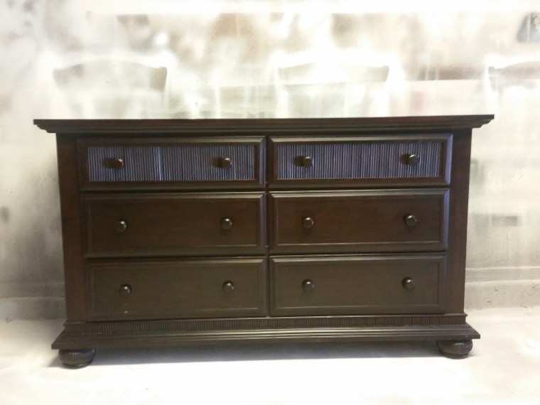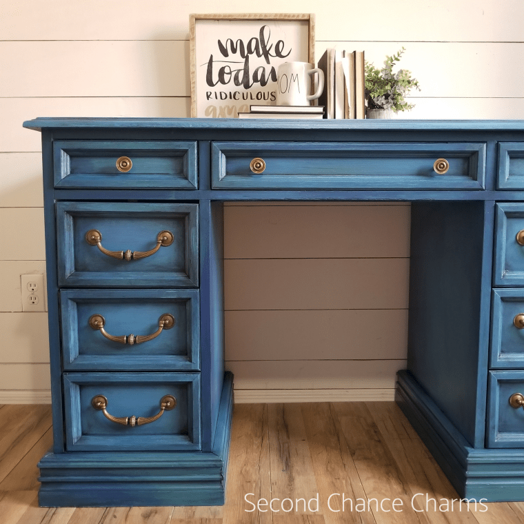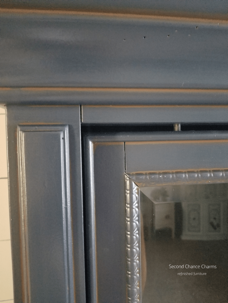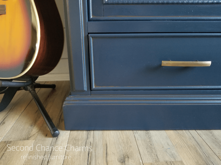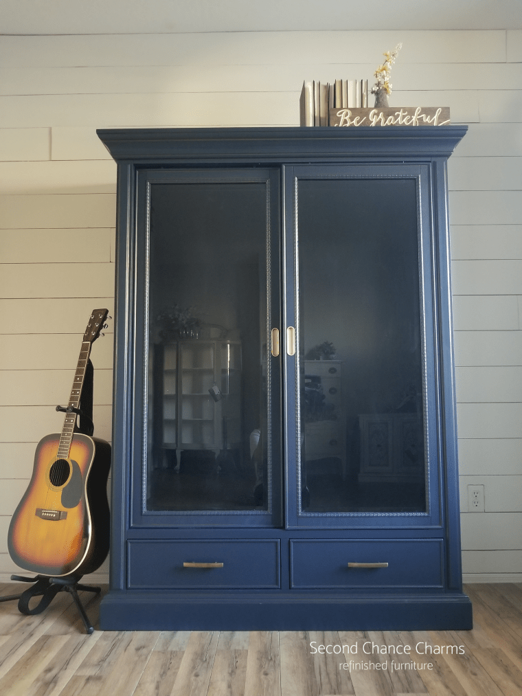 Refinished in a custom color mix by me using three different shades of Sherwin-Williams blues, I will call it ‘Frank Sinatra Blue’. Glazed in Brown and hardware revamped in champagne bronze.
