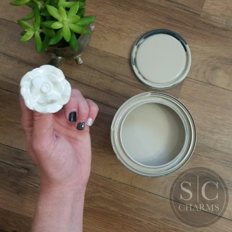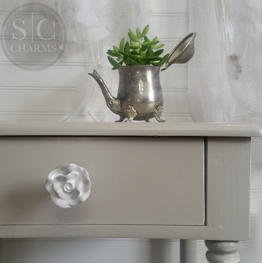 Refinished in Sherwin-Williams Reflection with a light distressed finish. Added new white chippy knobs from Hobby Lobby. These gals are officially farmhouse chic!