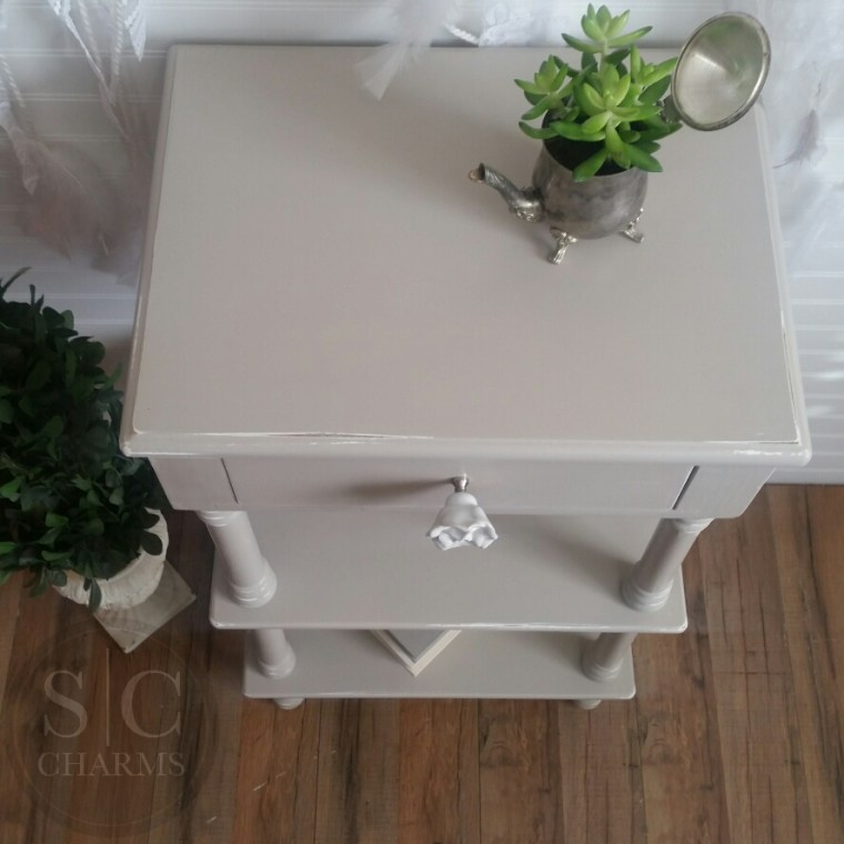 Refinished in Sherwin-Williams Amazing Grey lightly distressed. Original knob polished.