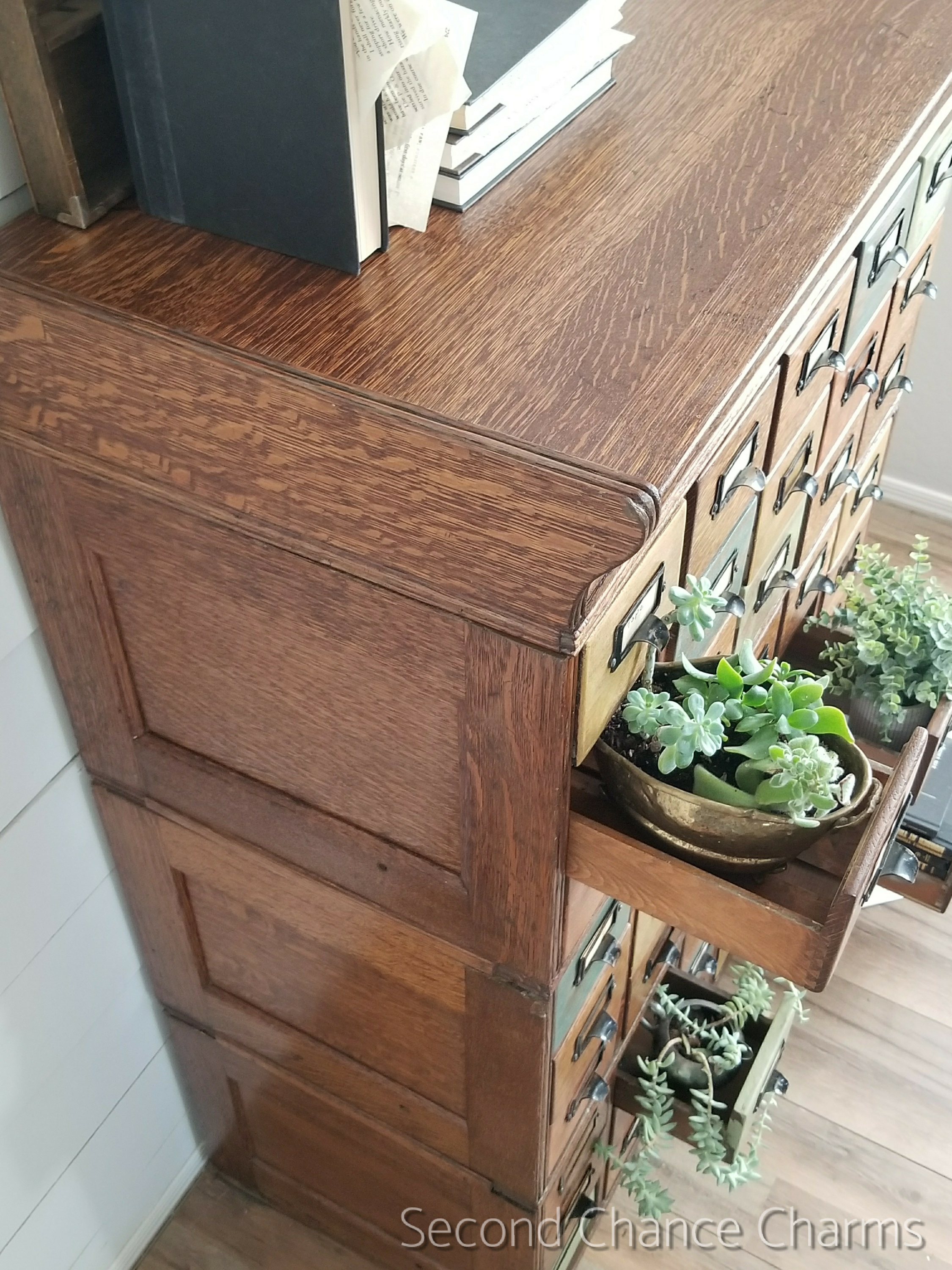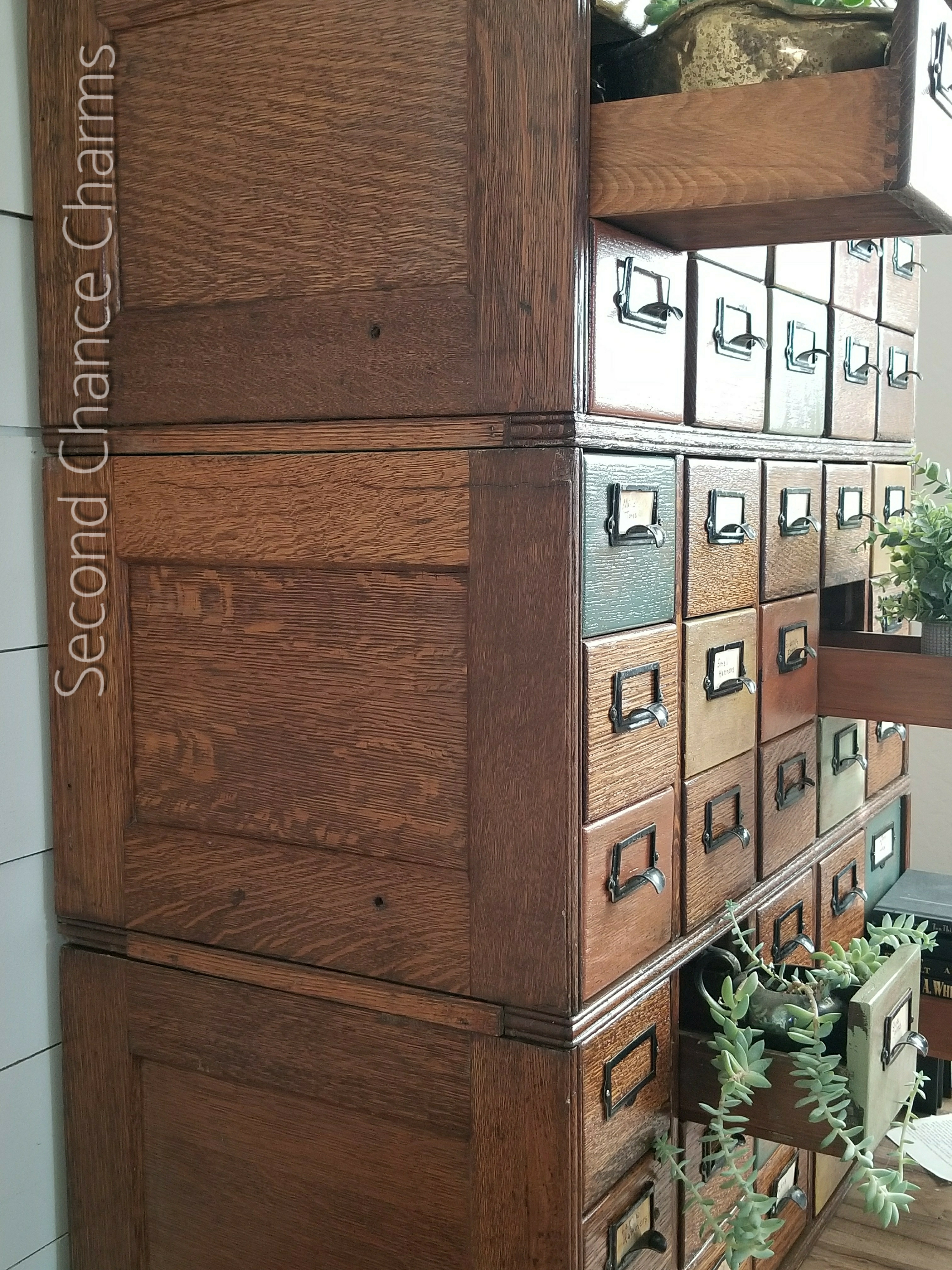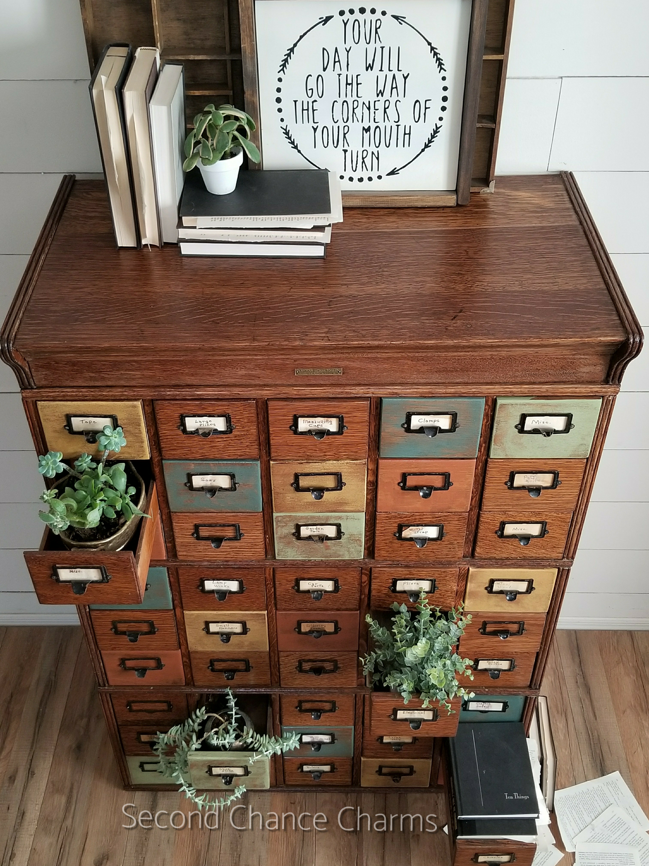 I distressed the drawers that had color on them for the final vintage worn look. I am so proud of how this 1920’s Yawman & Erbe MFG. CO. Rochester N.Y. 45 drawer Library, Apothecary, Antique Industrial Card File turned out!! The card file has four sections: Top section with a brass plate identifying the manufacture (hidden behind paint in the before photo). Three sections with 15 card files each. Three boxes were built to replace the missing ones, two broken faces were repaired and four new catalog hardware was added to complete this restoration project!