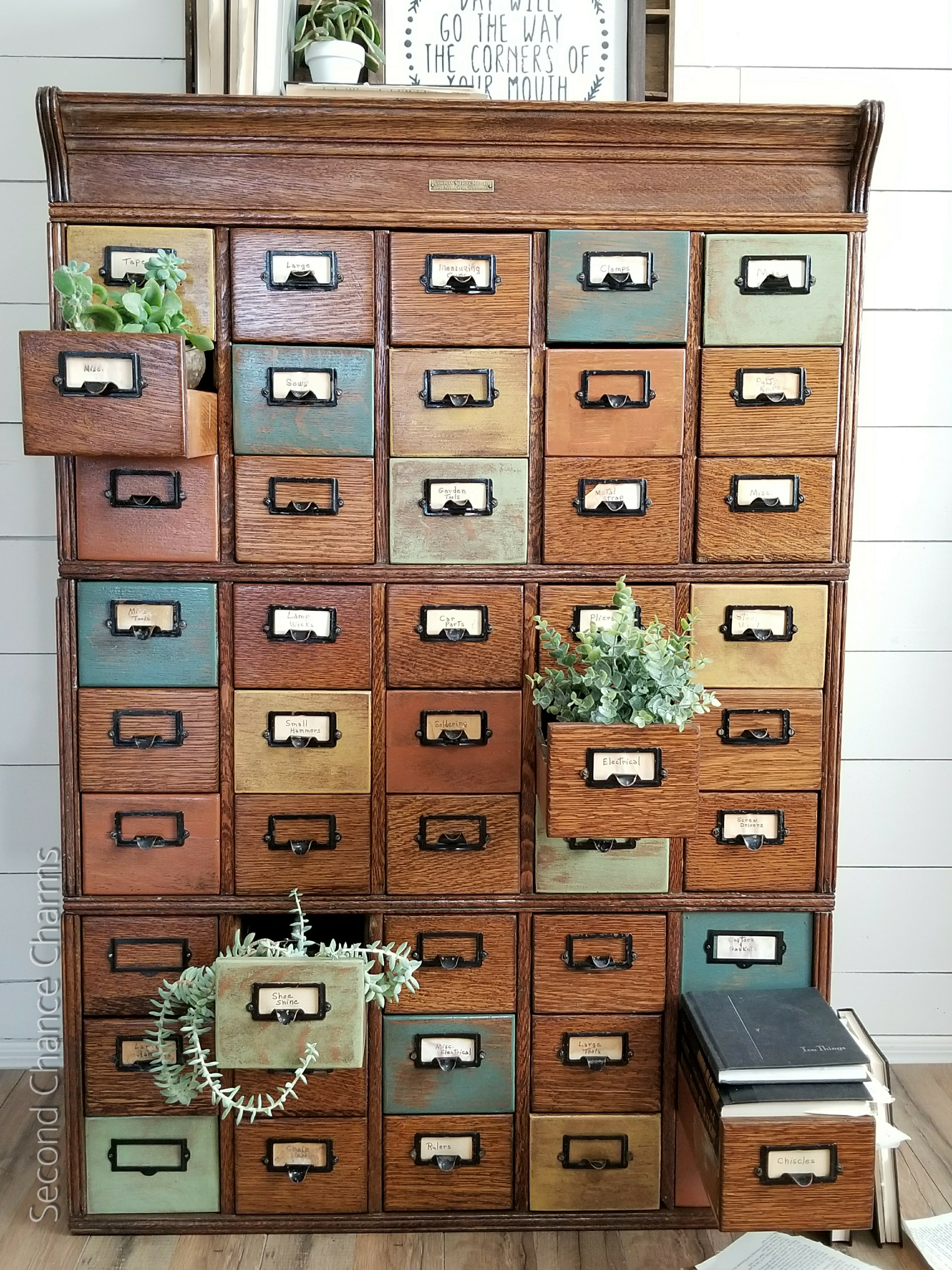 Worth the wait, wouldn’t you agree!? My first piece to the new year! Meeep!!! I want to start off by saying, I believe that every furniture refinisher out there wants to be able to say they refinished or restored an antique library card catalog storage cabinet, at least once. Secondly, I think it’s safe to assume that everybody wishes they owned one! I can check off one of those things! I completely swooned when I got my hands on this old fellow. He belonged to my great-grandfather and it was used to store his nick knacks and small tools in his garage. I am not sure how he encountered such a piece but let me just say- he used it for all its possibilities. After his passing in 2011 my mother held on to this lovely old gem, stored away in her garage, waiting for a Second Chance.