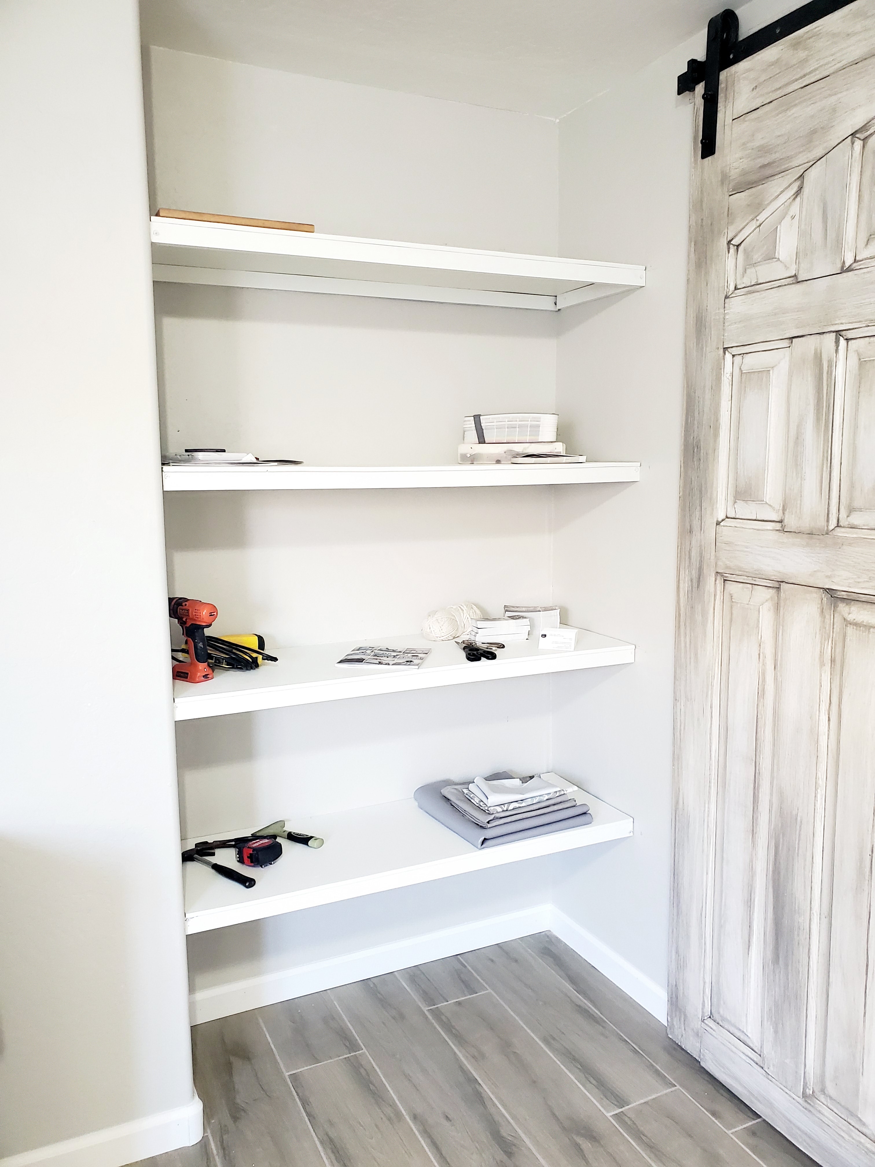 Enclosing this area and making it a den is perfect for anyone who will need an office/playroom or for me, a boutique room to store my inventory pieces and staging area! With two openings entering this room; one hallway area and a huge arch doorway. I had a few ideas. I wanted to enclosed the hallway area providing shelves for storage and add barn doors to close off the room when not in use.
