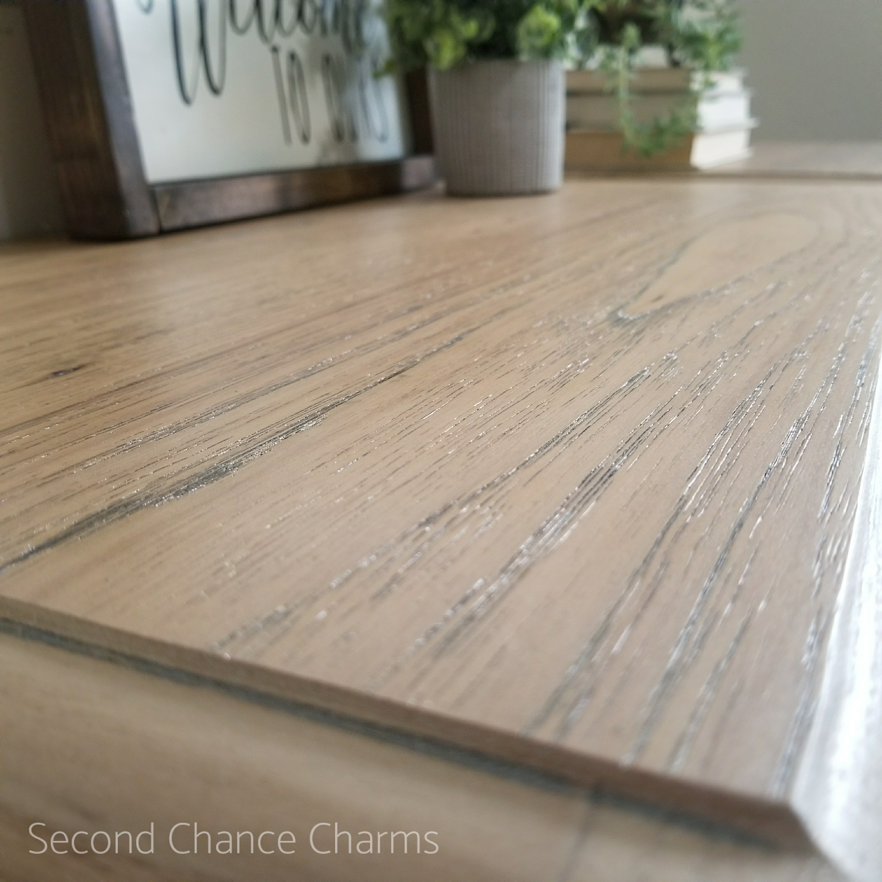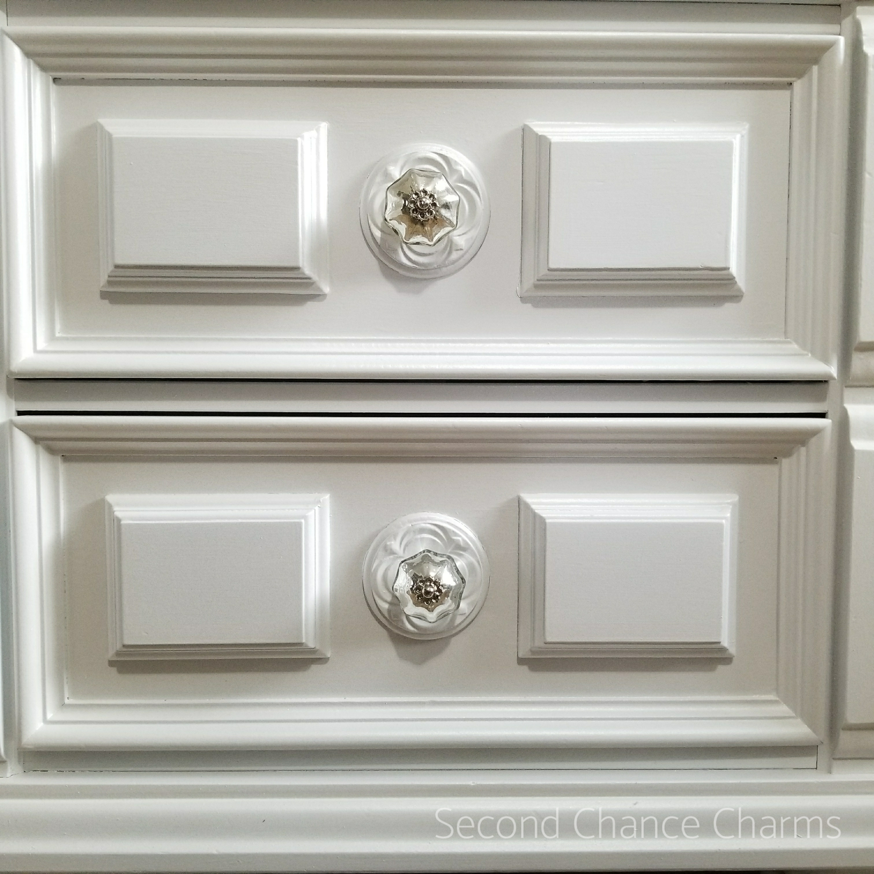 Refinished in Sherwin-Williams Snowbound and coated with Faux Impressions Metallic Pearl for that shine. The top has been sanded down to raw wood and coated with the same Metallic Pearl. These beauties are really amazing! We finished the set with adding Antique Silver Mercury Scallop Knobs from Hobby Lobby. Love!!