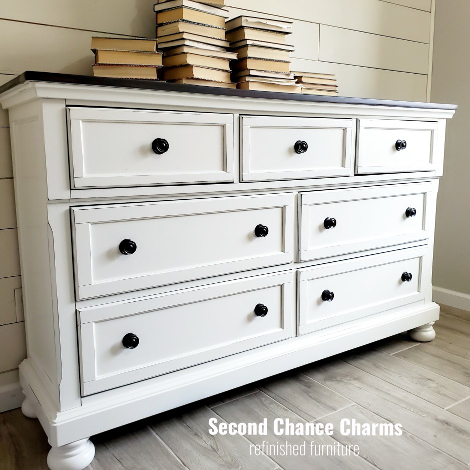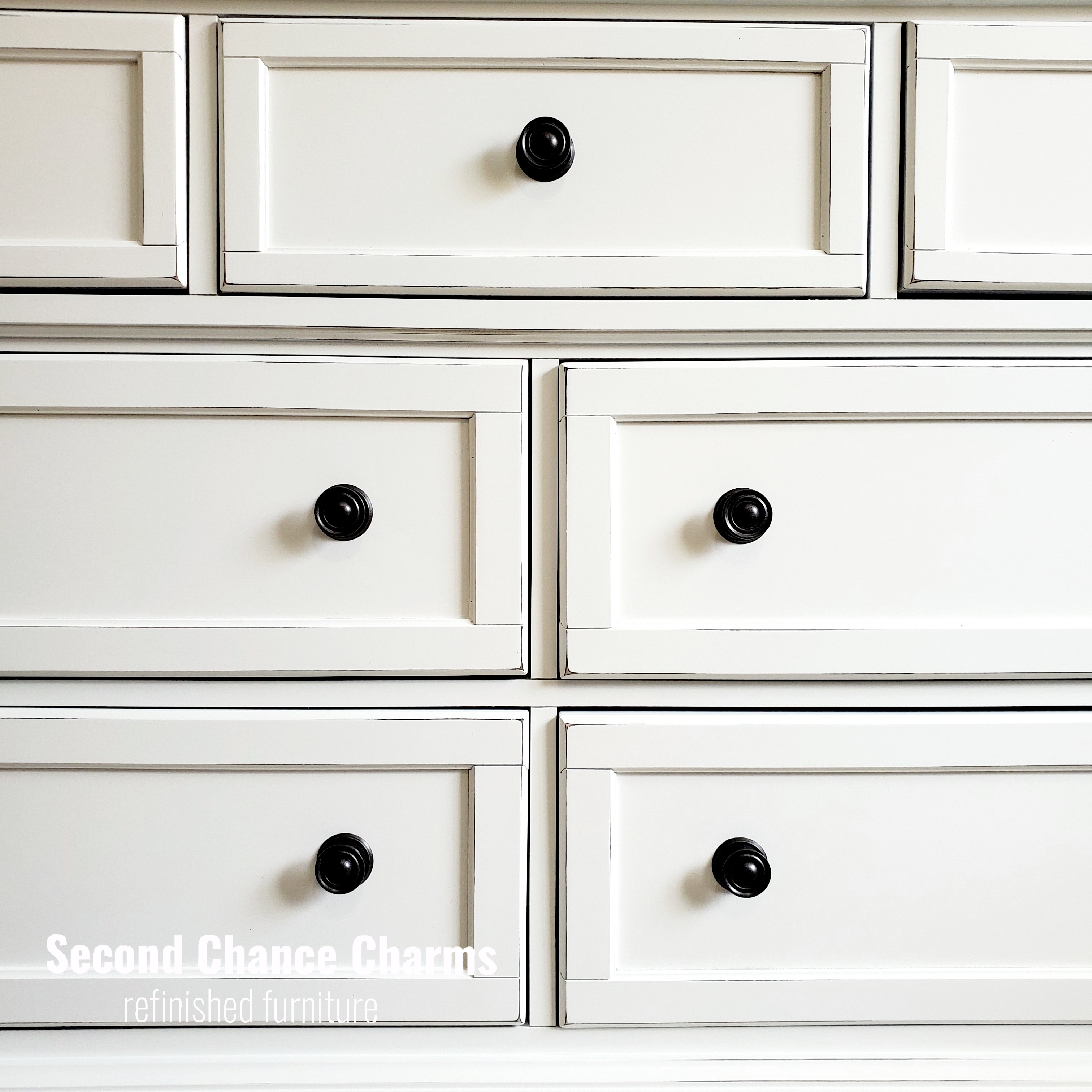 Refinished in Sherwin Williams Greek Villa and lightly distressed in the lines. Top stained in Minwax Weathered Teak. Original hardware revamped in Oil Rubbed Bronze. Light, bright and airy! My pup loves it too!