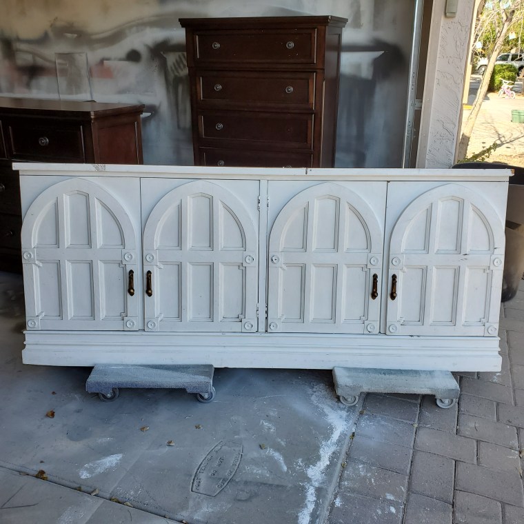 Refinished in Sherwin-Williams Greek Villa and lightly distressed in the lines. Top stained in Minwax Weathered Teak. Original hardware revamped in Oil Rubbed Bronze.