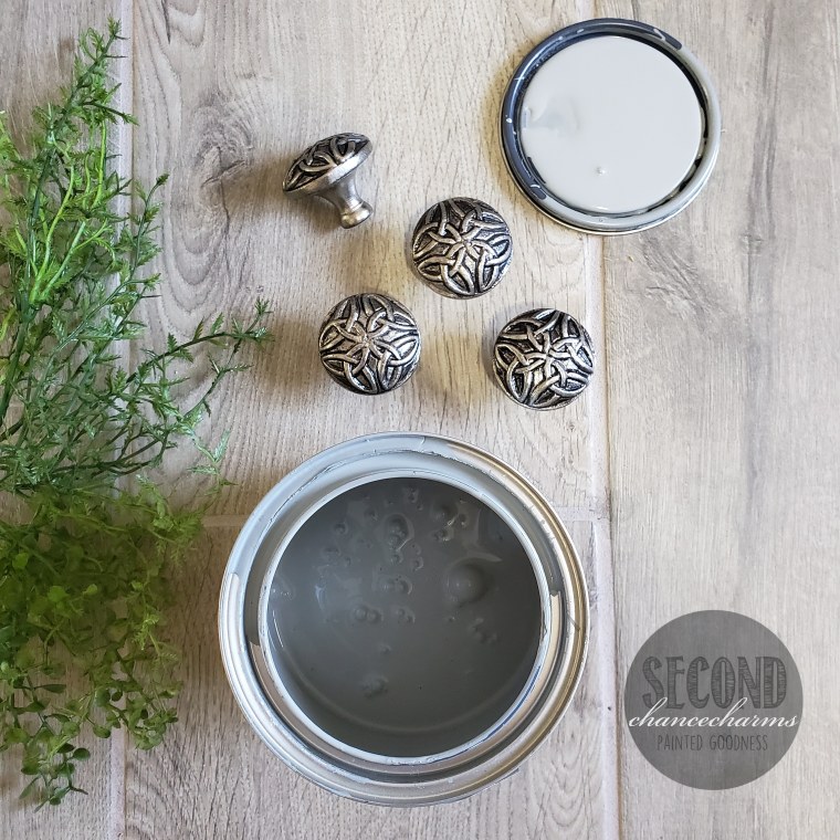 Refinished in Sherwin-Williams Dovetail and Reposed Gray. Glazed using Black Fox. New hardware purchase from Hobby Lobby and revamped in nickel and black glaze for an added bling.