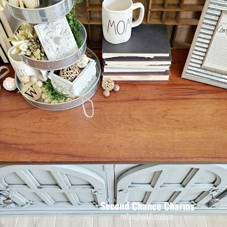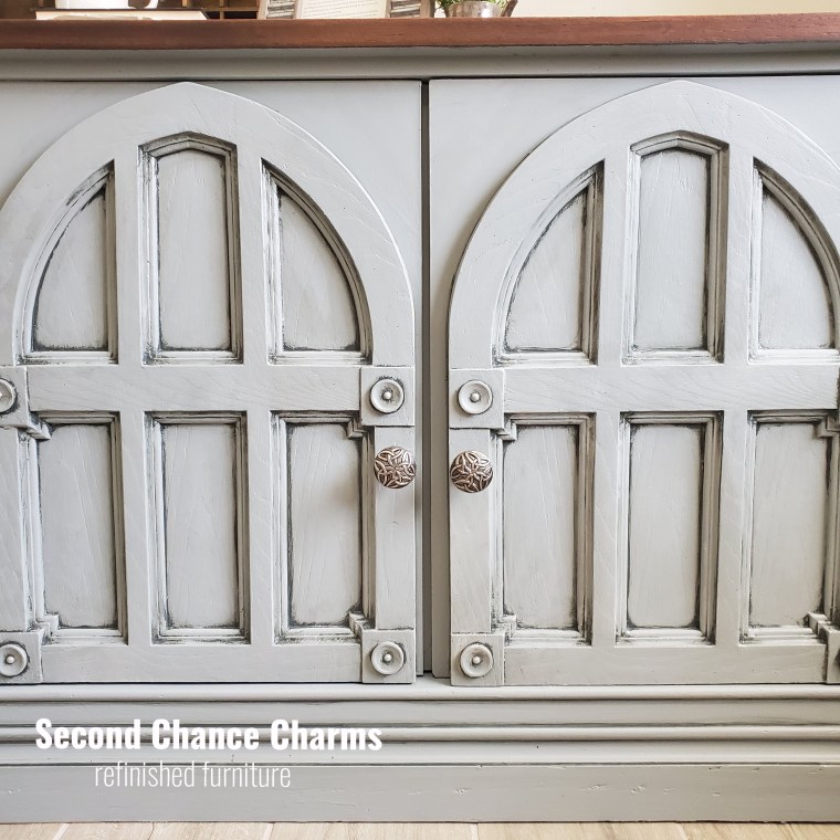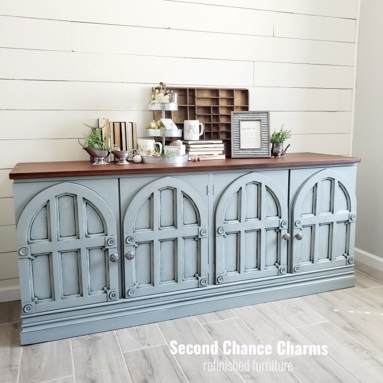 Where do I start with this one!? At my clients color consultation she shared with me the interior decorations that were on order for her living room. Shades of blues, greys and browns. From a new couch, pillow shams, rugs and more, I recommended using Sherwin-Williams Tin Lizzie, a soft grey with a blue huge. Glazed in a dark grey using Rock Bottom which also has a complement huge to Tin Lizzie. I picked up these Nickel Celtic knobs from Hobby Lobby that caught my clients eye. Staining the top in Minwax Special Walnut completes his look! Not only is this handsome fellow large but super heavy with 6 large drawers inside the four cathedral like doors. Totally in love with him!