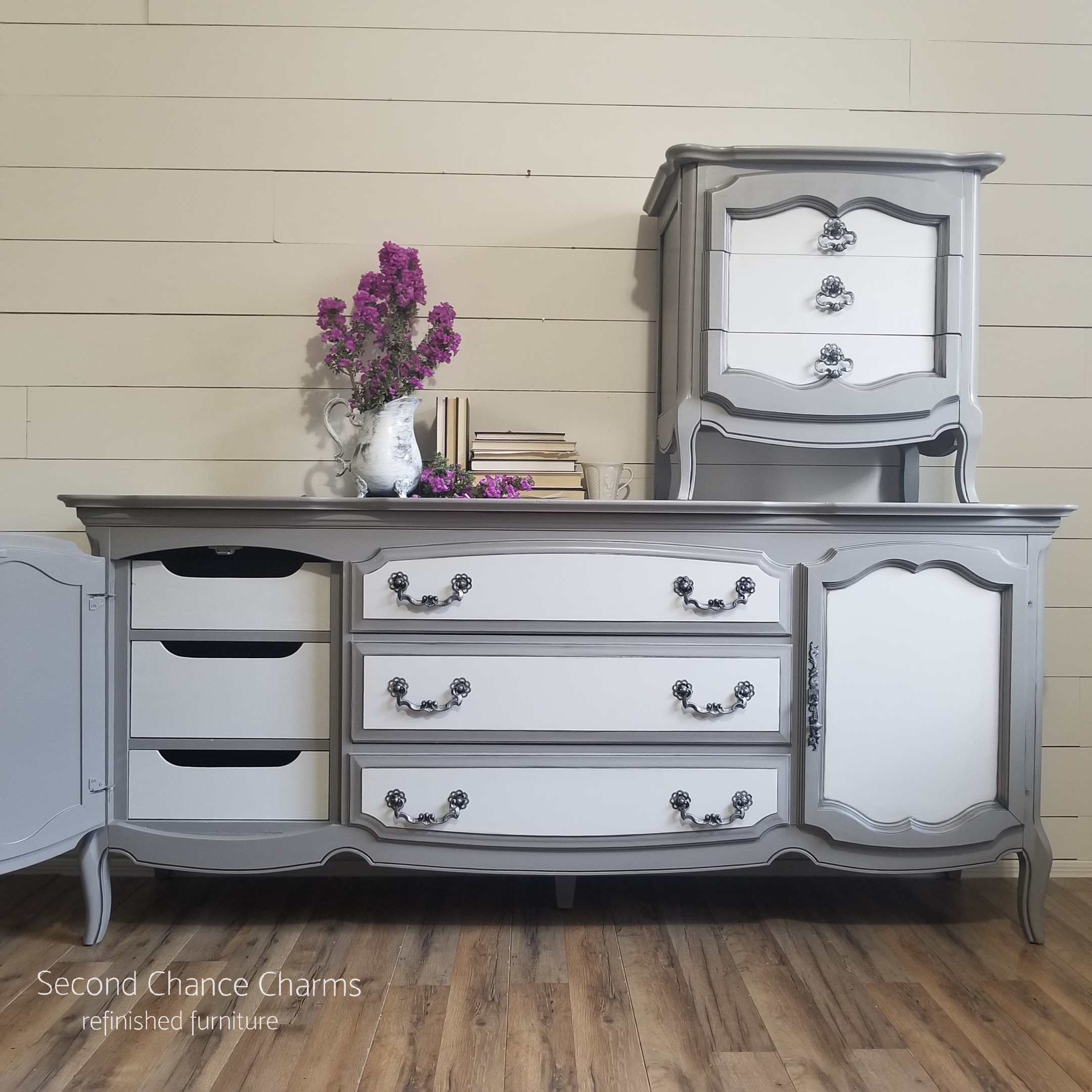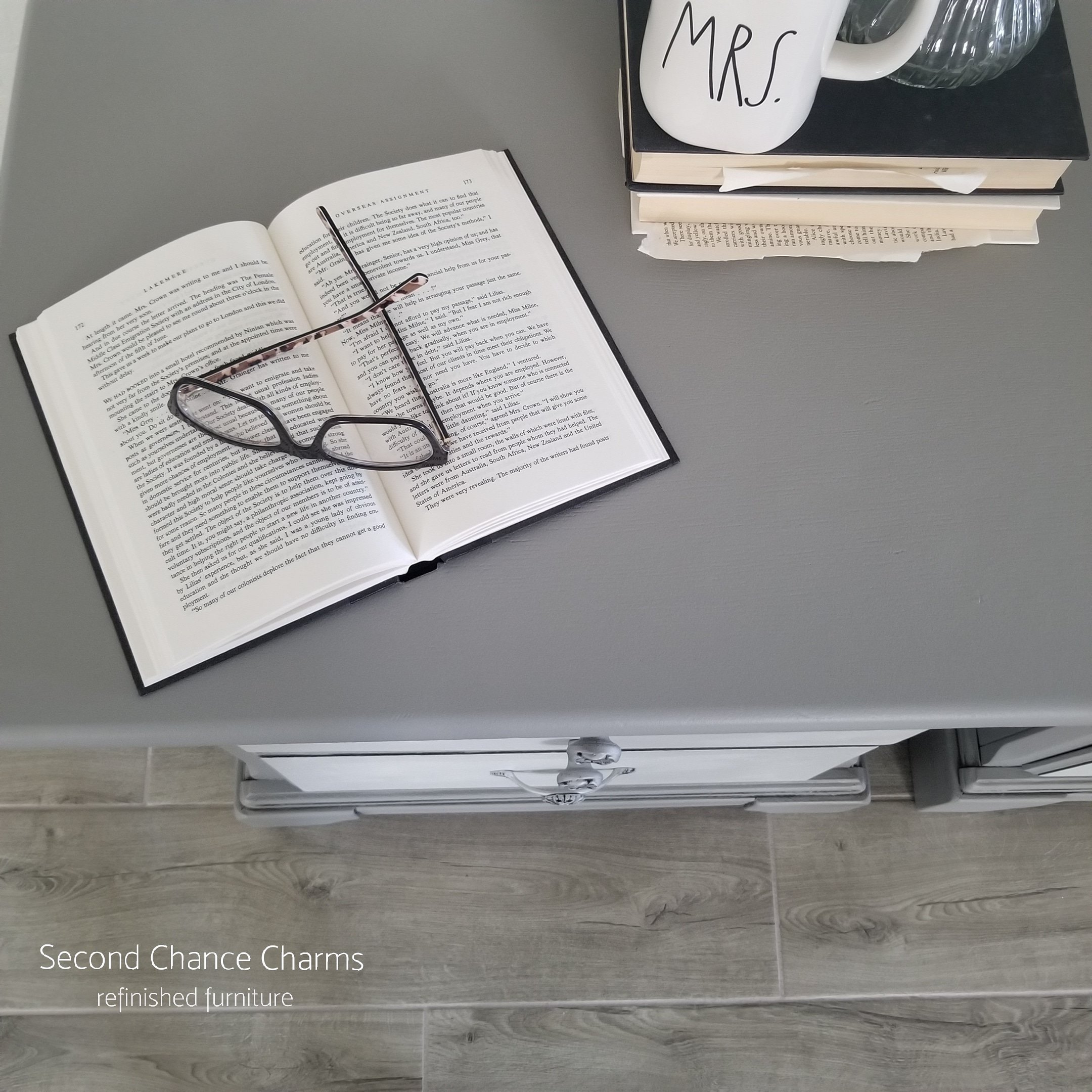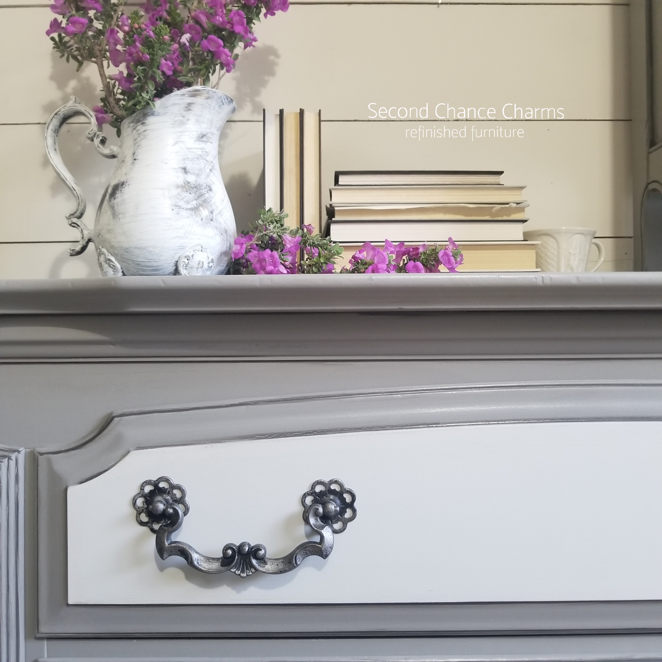 Refinished in Sherwin-Williams Reposed Grey, it showcases a soft, calming hue that complements a variety of interior designs and color palettes. Slightly distressed for that farmhouse chic vibe, the piece carries a warmth and character that invites comfort. I added charming half moon pulls in oil rubbed bronze, which not only enhance its aesthetic appeal but also provide a tactile element that is pleasing to the touch.
