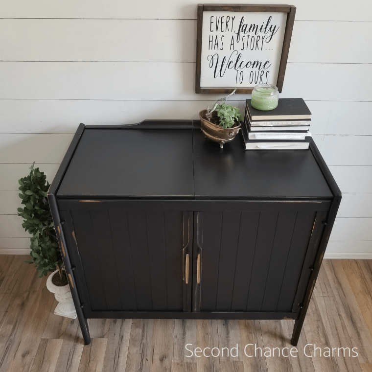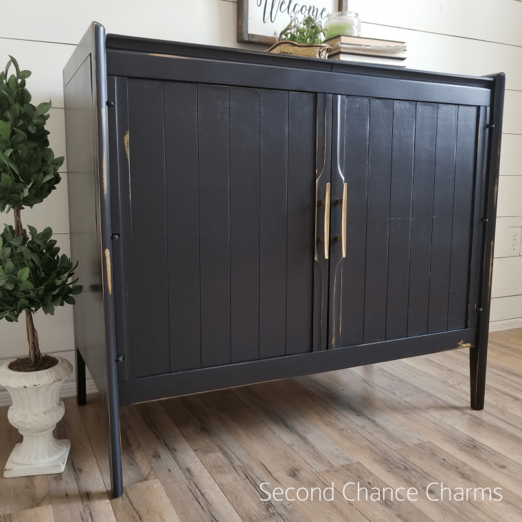 Refinished in Sherwin-Williams Tricorn Black and lightly distressed around the edges. The original hardware has been polished and cleaned for that vintage look.