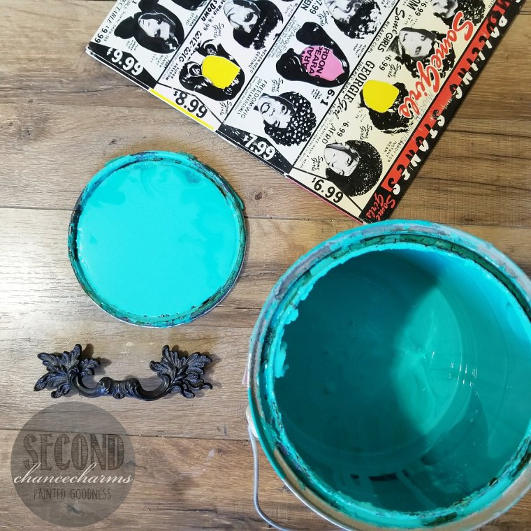 Refinished in Sherwin-Williams Synergy and glazed in Turkish Coffee brown. Original pull revamped in Bronze.