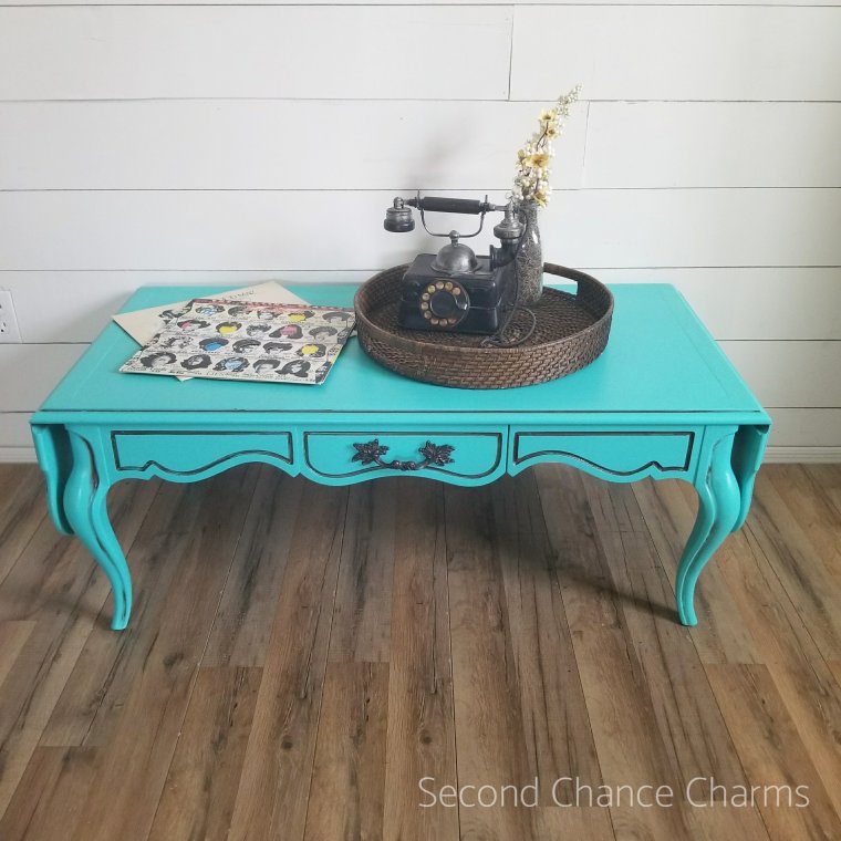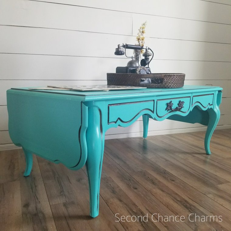 Sticking with a bright color for that POP in her home, my client wanted this distressed coffee table to be glazed. You can really see the difference between the two styles with the before picture comparison.