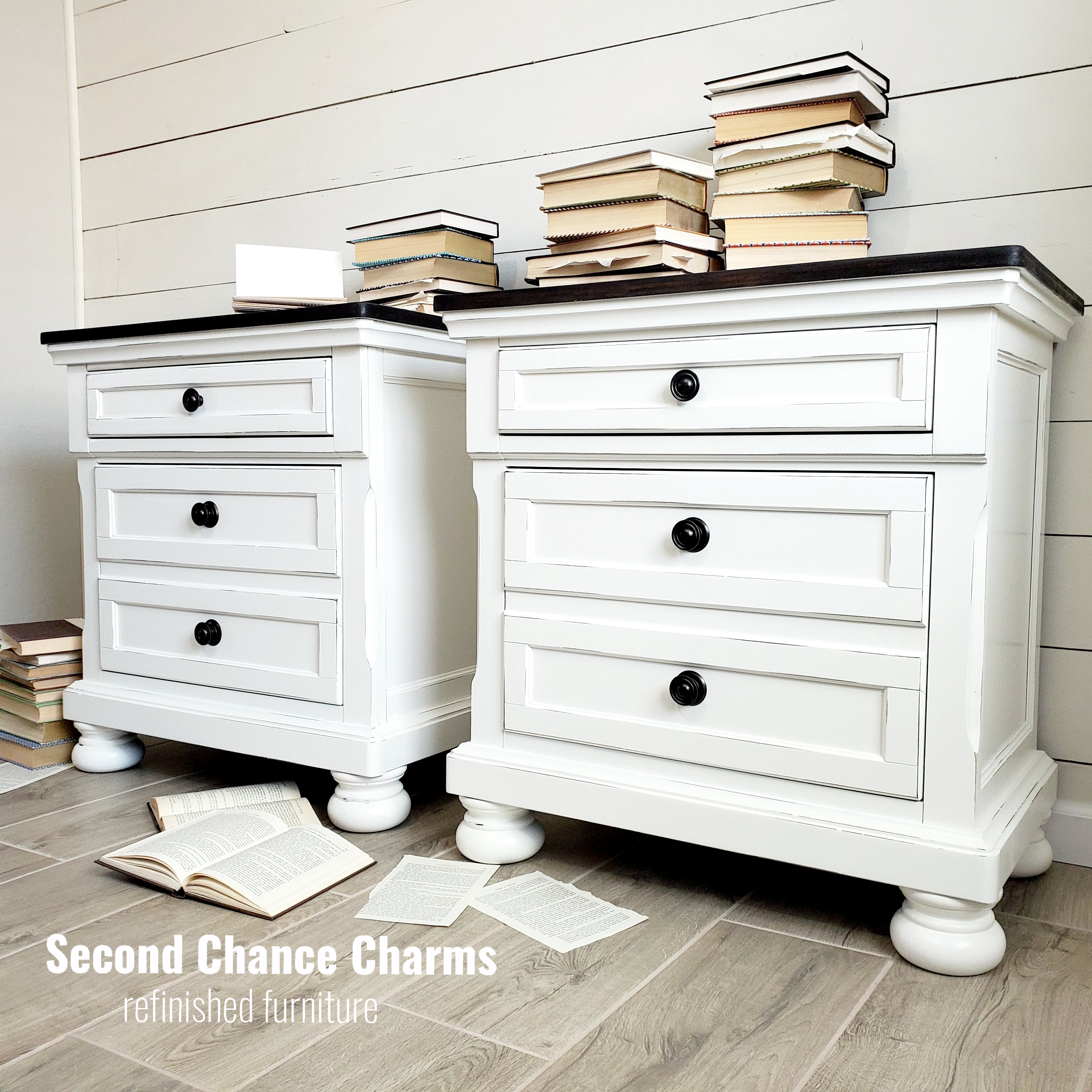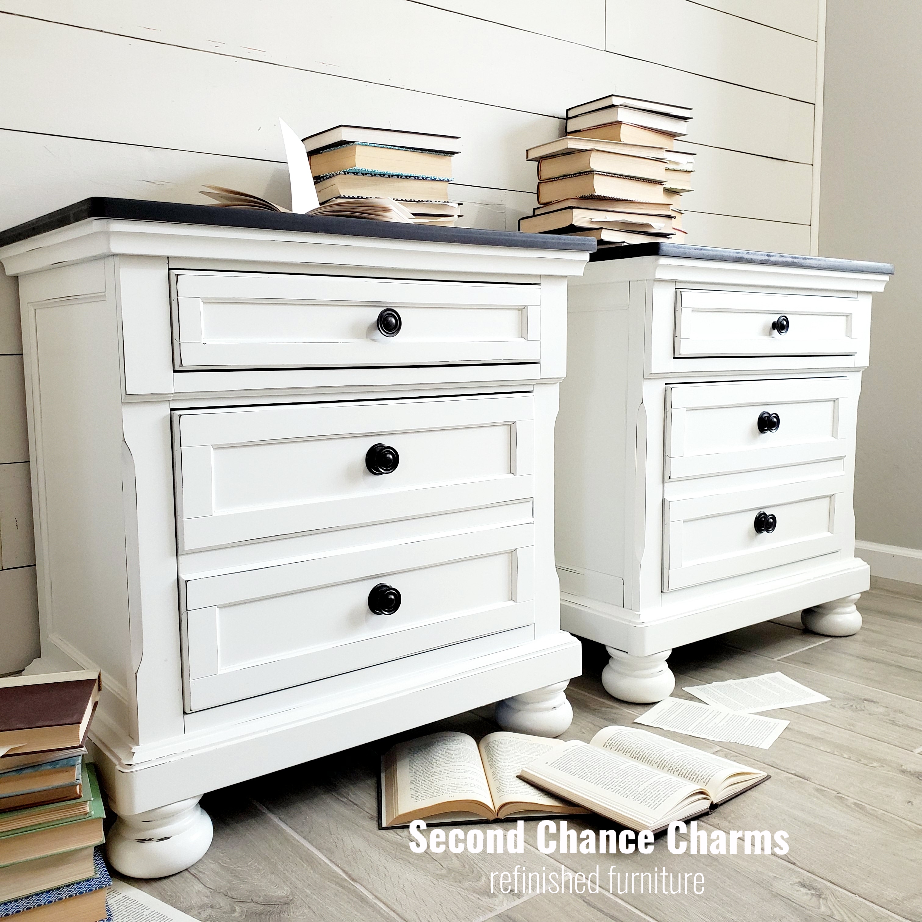 The first two pieces to my clients four piece bedroom set. Refinished in Sherwin-Williams Greek Villa and lightly distressed in the lines. Original hardware revamped in Oil Rubbed Bronze. Top stained in Minwax Weathered Teak. Stay tuned in for her matching dresser and his chest of drawers!