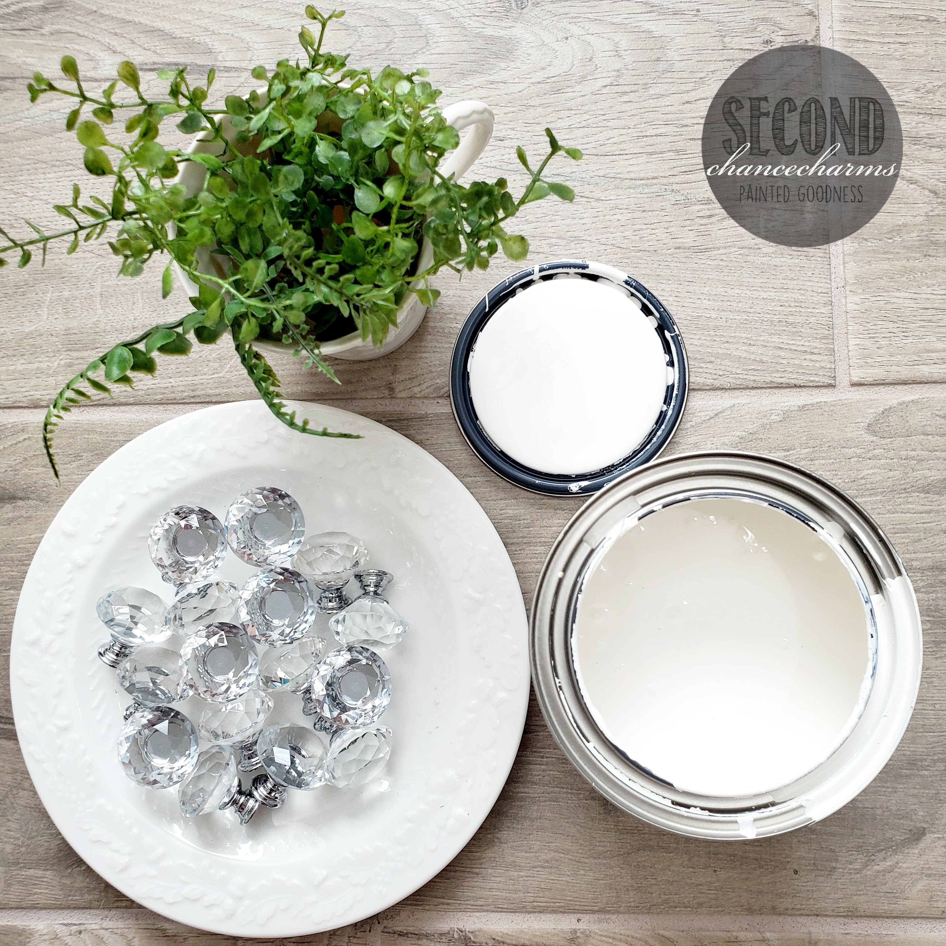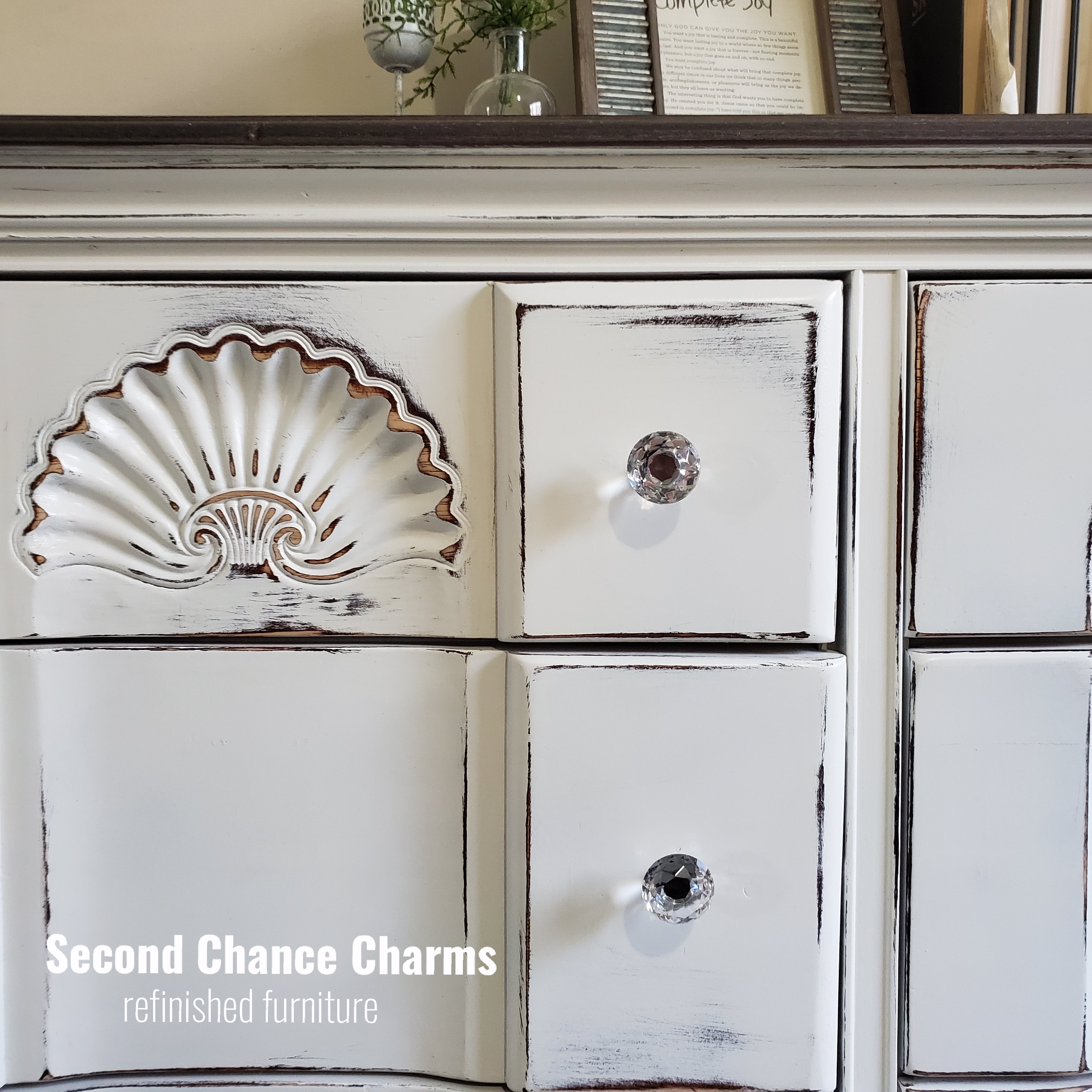 Refinished in Sherwin-Williams DE color Swiss Coffee and distressed. Stained the top in Minwax Weathered Teak. Added new crystal knobs my client purchased.