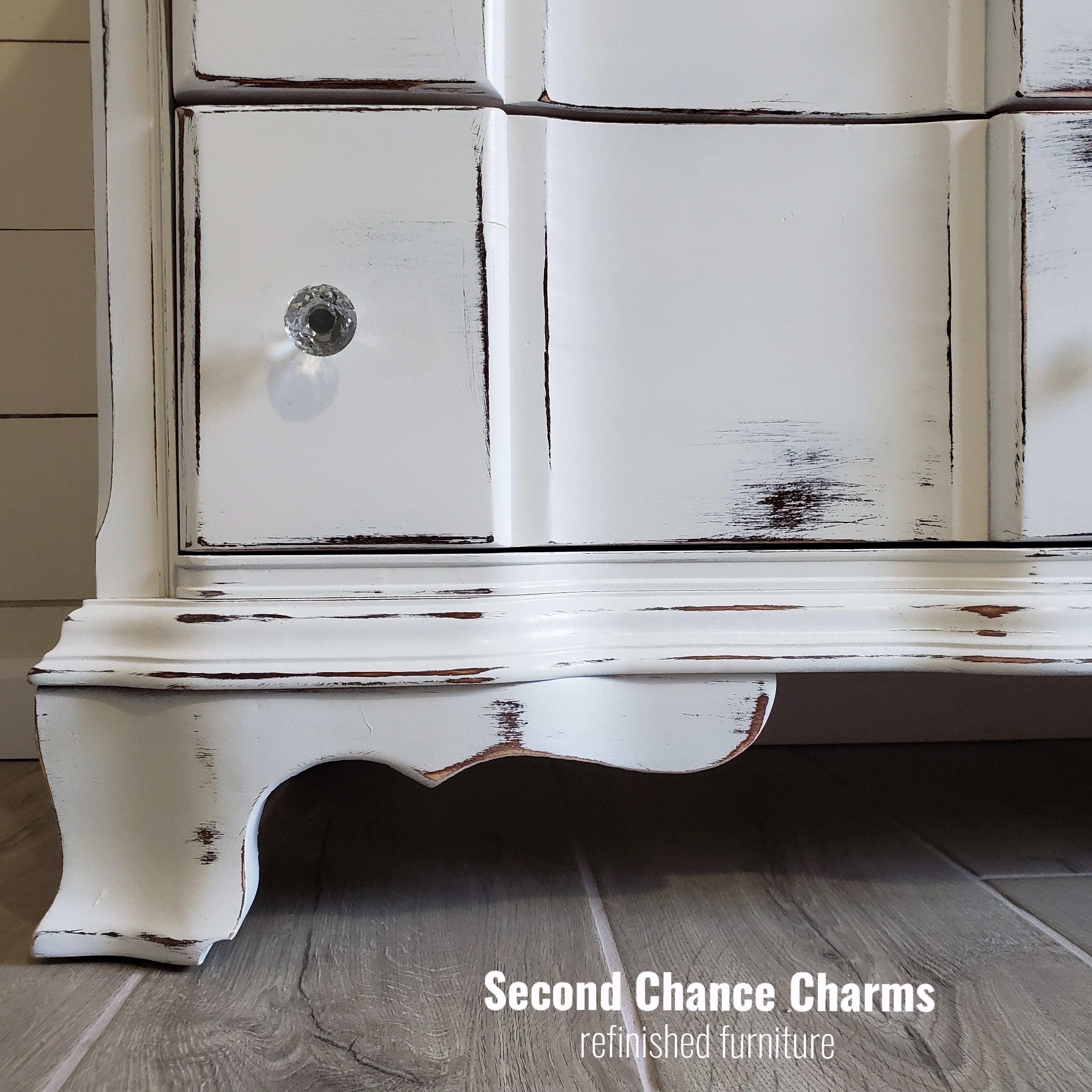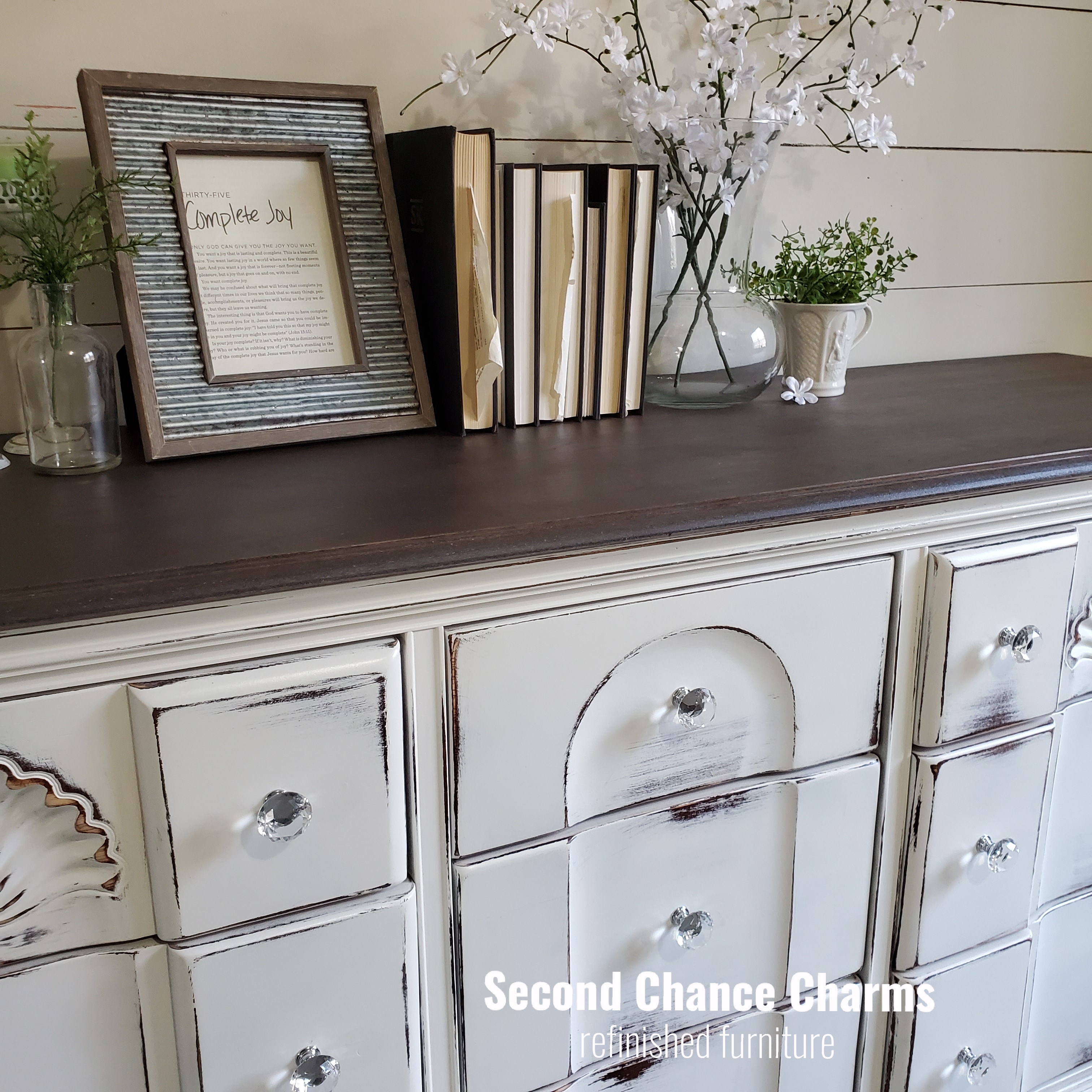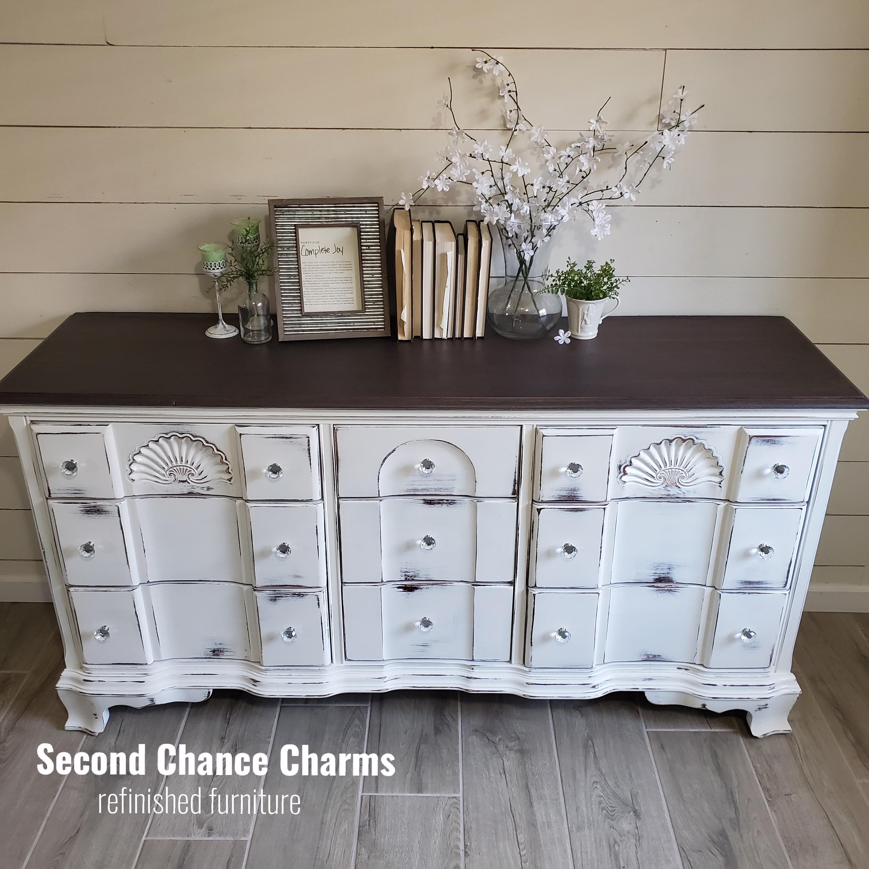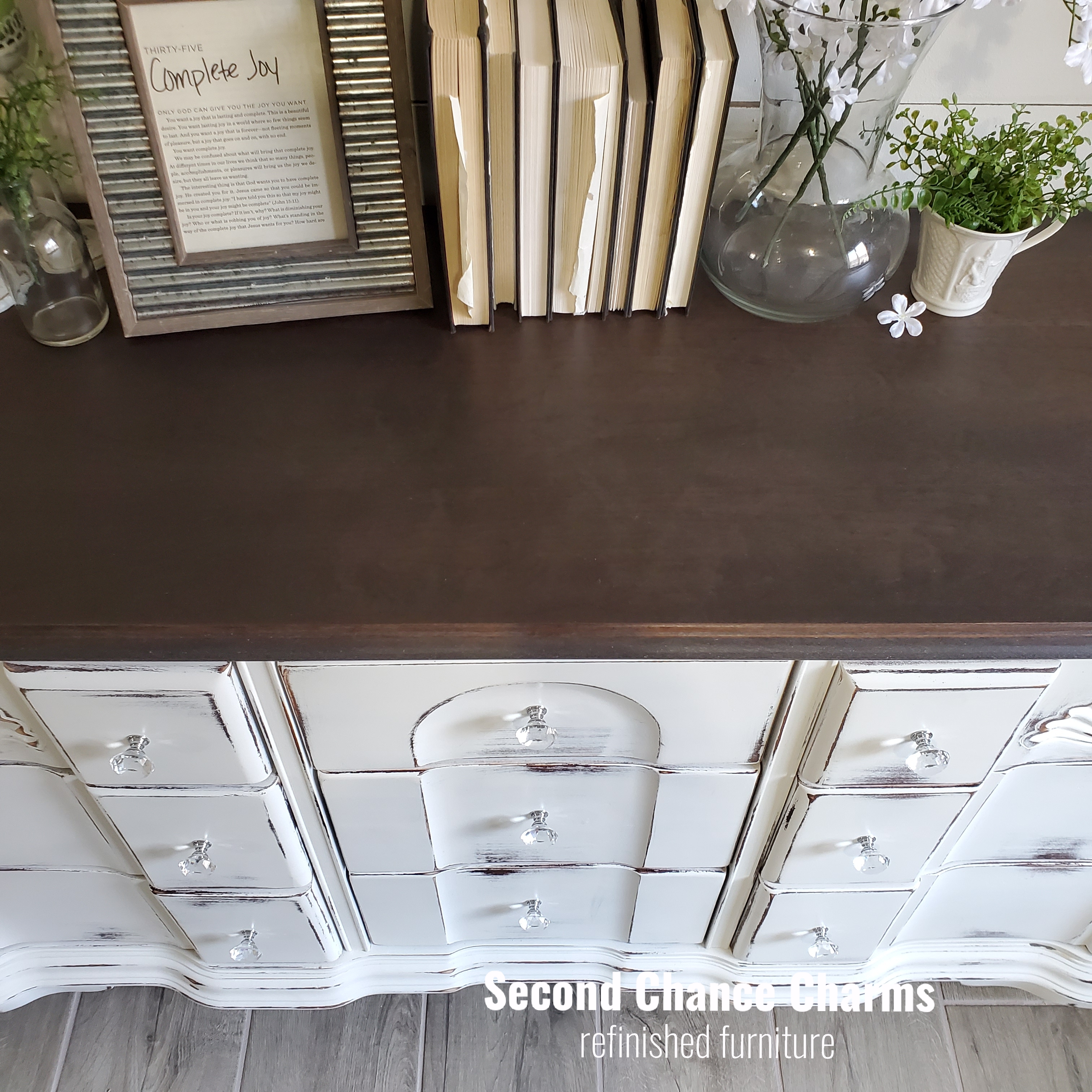 Refinished in Sherwin Williams Greek Villa and lightly distressed in the lines. Top stained in Minwax Weathered Teak. Original hardware revamped in Oil Rubbed Bronze. Light, bright and airy! My pup loves it too!