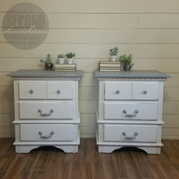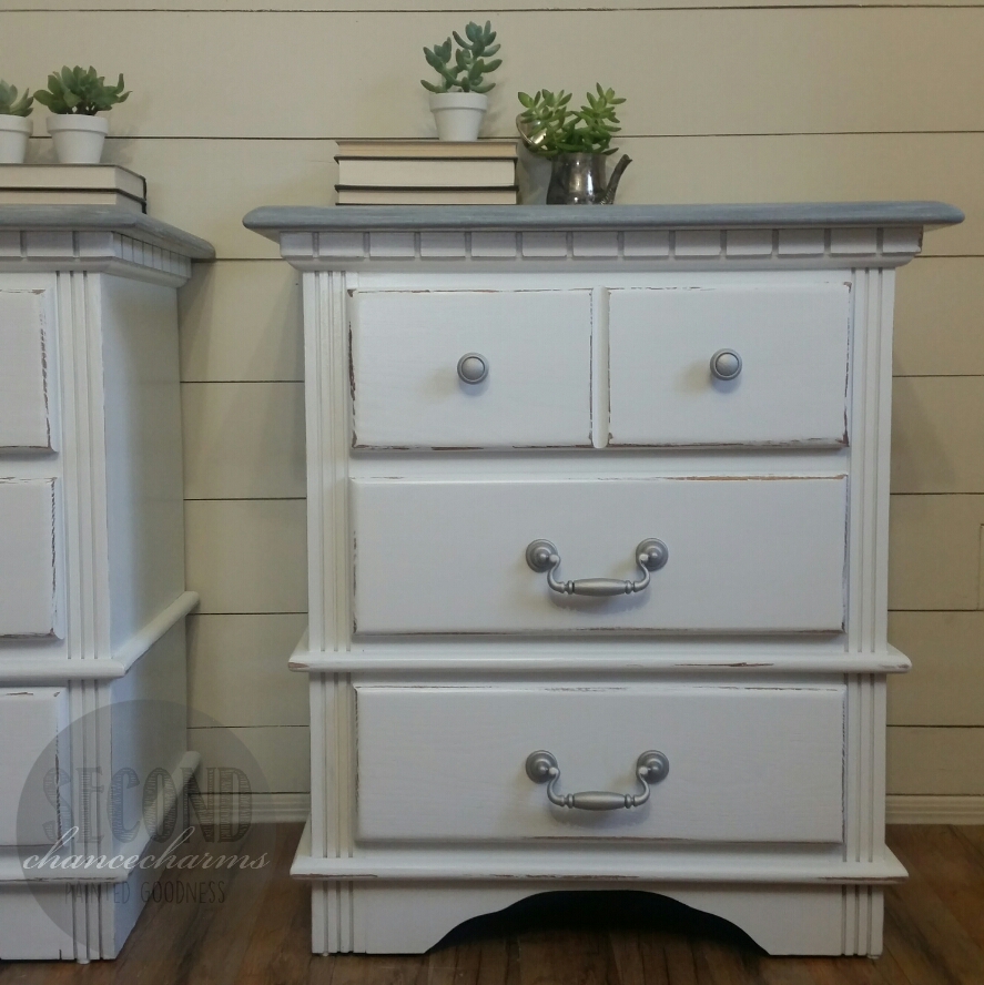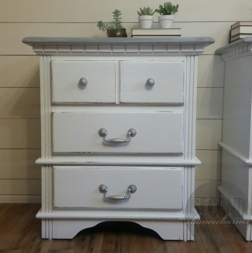 Refinished in Sherwin-Williams Snowbound and lightly distressed. Because the wood is mahogany, I used a couple coats of White stain and then a topcoat of Charcoal Gray stain that way our top would end up gray and not red or pink from the natural wood color. Original glass and knobs cleaned. Speaker screen thrown out, giving this gal another shelf to use!